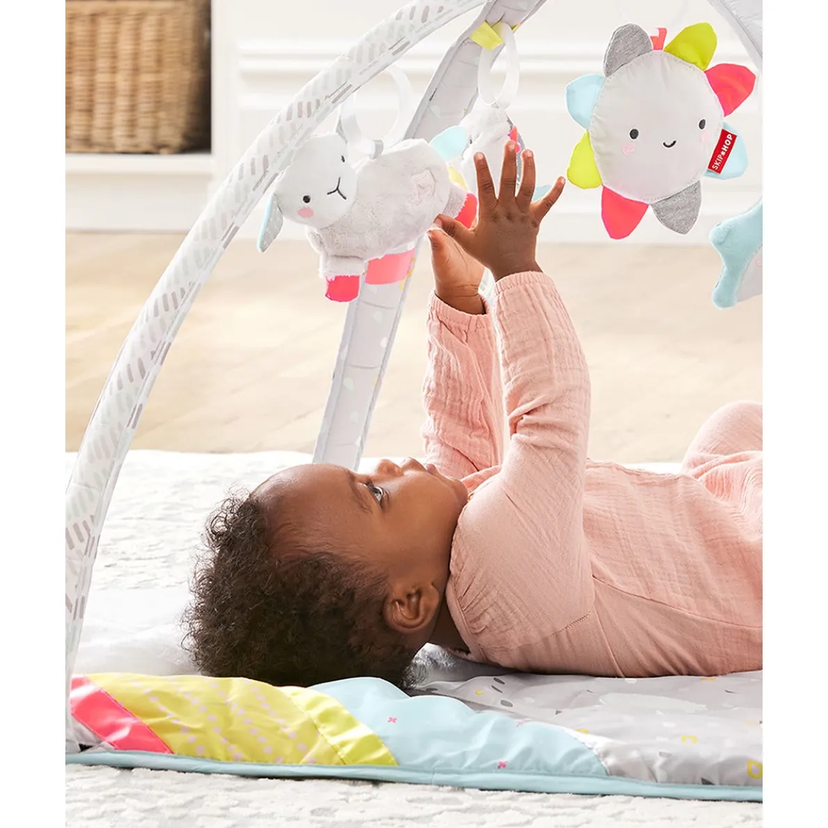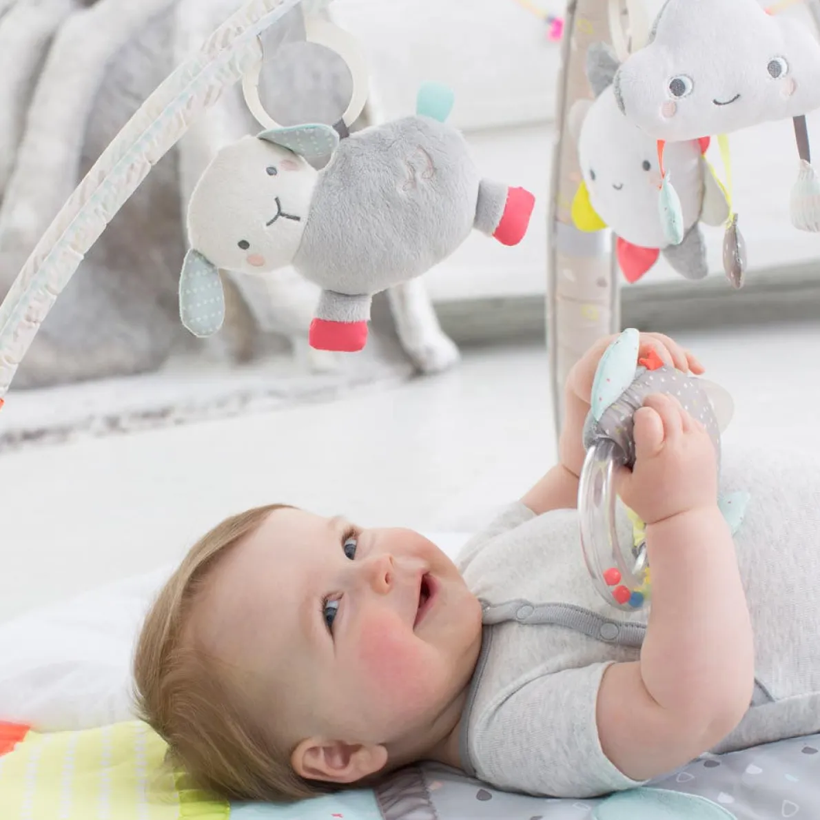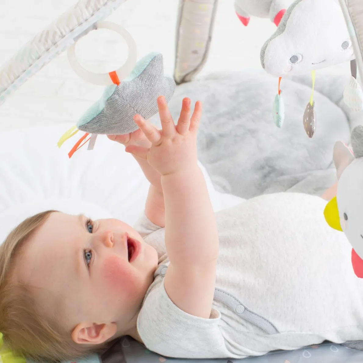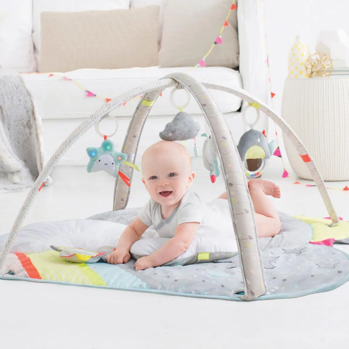 Every cloud has a silver lining—and this dreamy baby activity gym is no exception! Offering hours of plush playtime, it features a soft color palette to complement modern décor along with pops of bright colors to stimulate baby’s sight. Five celestial-themed hanging toys will engage baby with lights, music and other stimuli while the cushy mat offers ultimate, cloud-like comfort. When it comes to baby’s enjoyment, the sky’s the limit!