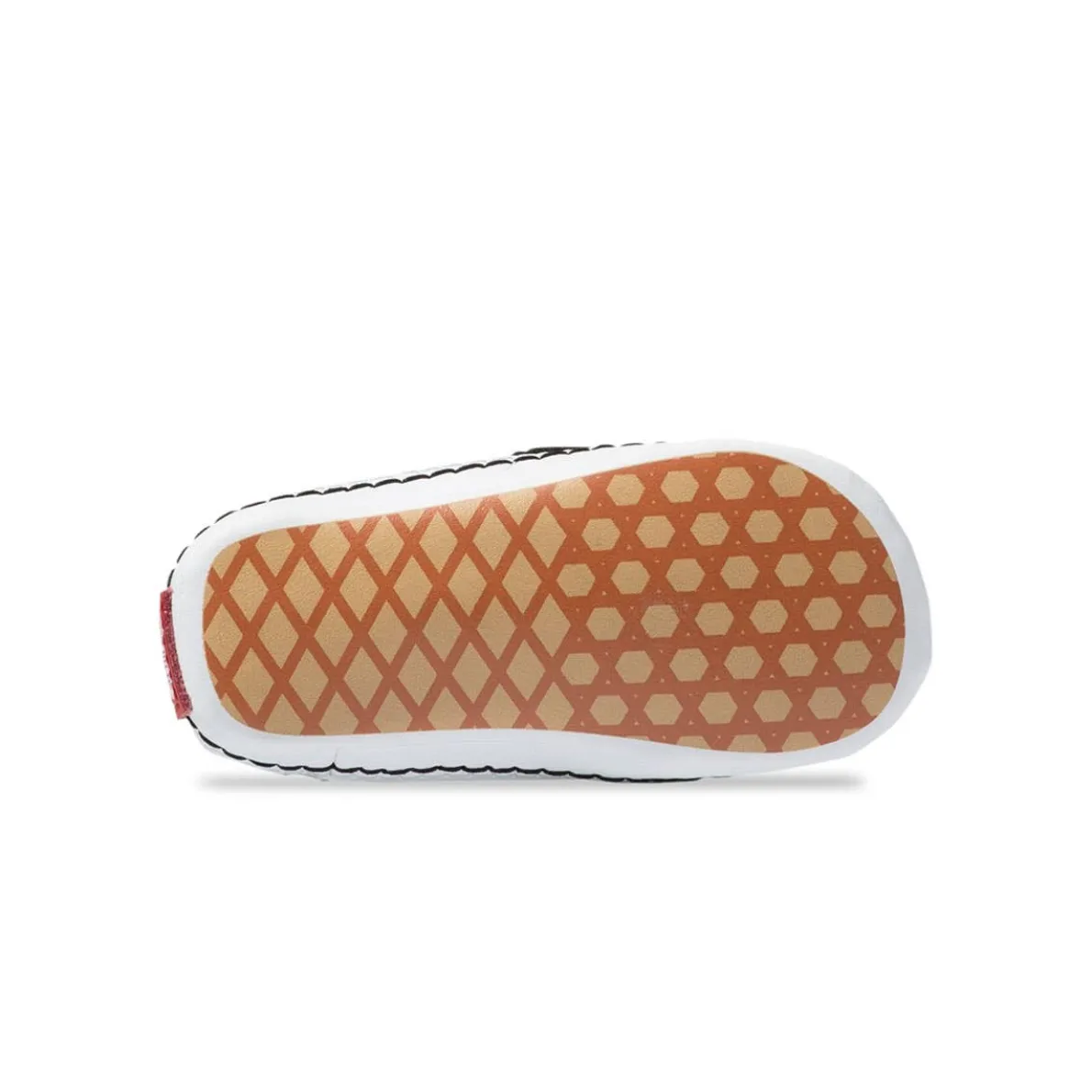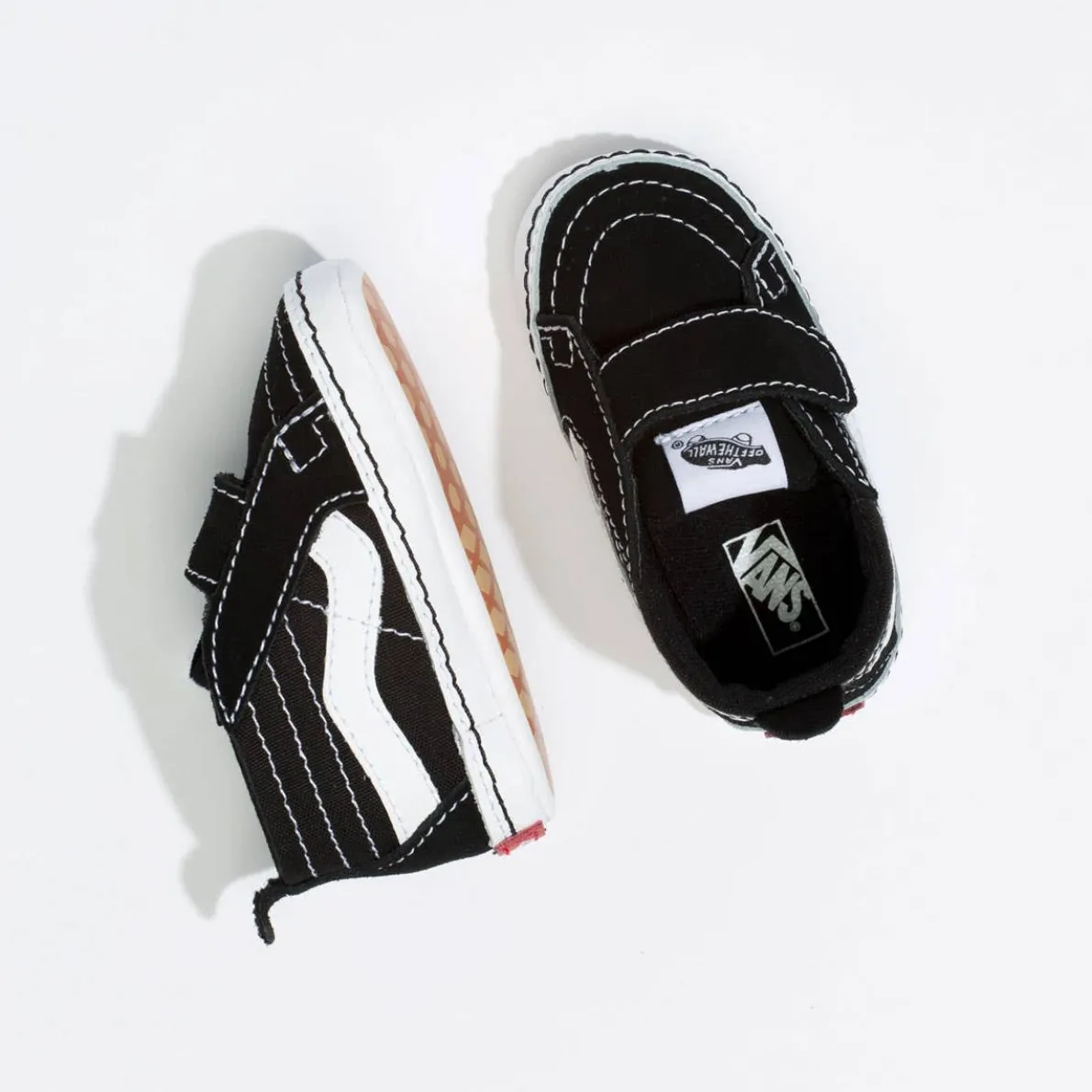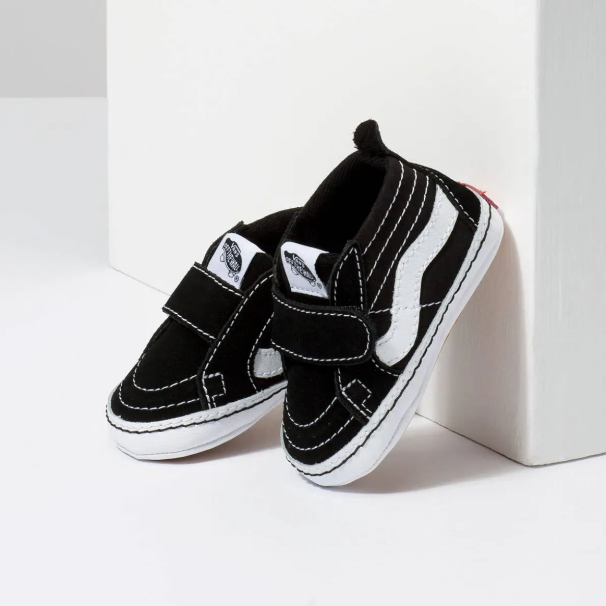 The Sk8-Hi Crib, redesigned for a perfect fit in the style of the original Sk8-Hi, features sturdy canvas and suede uppers, a hook-and-loop closure, and heel pulls for an easy on-and-off fit. A new print on the outsole mimics the iconic Vans waffle sole, and the addition of a Vans heel scab completes the classic look.