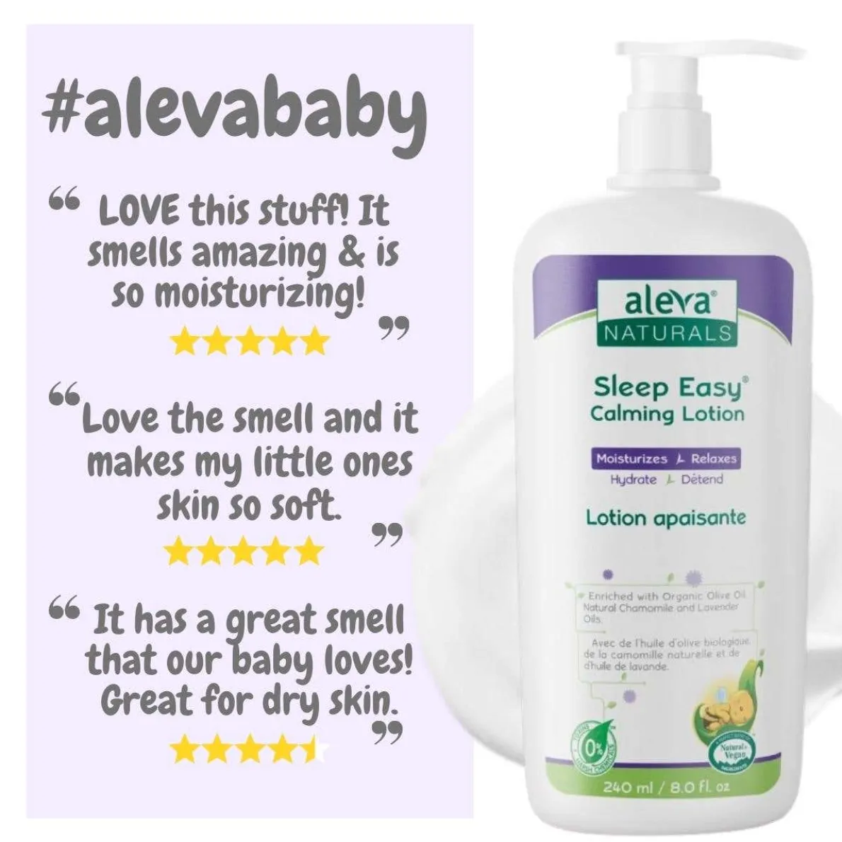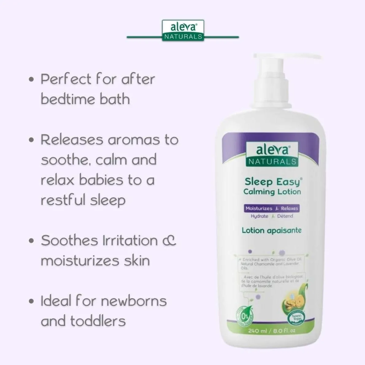 Have you been struggling to get your baby sleeping through the night? A moisturizer enriched with lavender oil can help to soothe and calm your baby to a long and restful sleep. Aleva Naturals Sleep Easy Calming Lotion is formulated to help pamper your baby as part of their night time routine. With a soothing blend of Lavender, Chamomile and Shea Butter, Sleep Easy Calming Lotion is gentle enough for newborn’s skin and will leave them smelling naturally fresh and clean! For best results, try using Sleep Easy Calming Lotion in combination with Sleep Easy Hair & Body Wash. Ideal from birth onwards.
