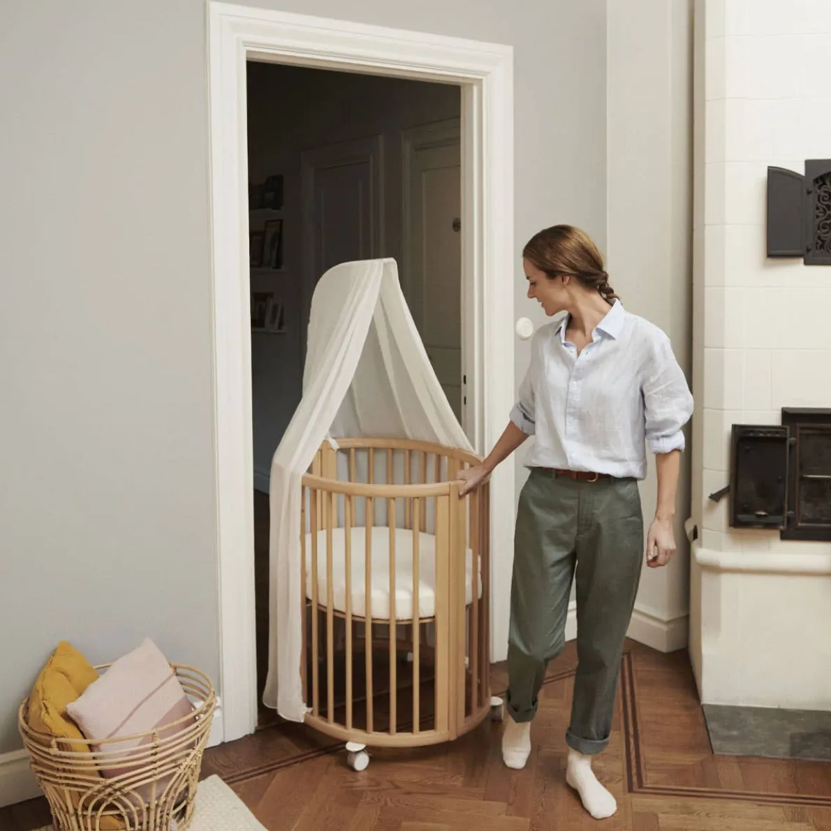 The Stokke® Sleepi™ Mini V3 is the ideal first bed for your newborn. Creating a nest-like environment, it helps baby feel snug and secure. Soft oval design cocoons your baby offering comfort and familiarity for restful sleep and the sweetest of dreams. The drape rod and canopy make it a truly elegant addition to any nursery. Lockable swivel wheels can be used to rock your baby gently to sleep and makes your crib easy to move from room to room. At only 67 cm / 26,4 in inches wide, it’s amazingly space efficient, making it ideal for petite nurseries. The Stokke® Sleepi™ concept has been developed with sound sleep and safety in mind. It is available with a new firm and breathable Sleepi™ mattress which exceeds the highest safety standards. Accessorize with the breathable mesh liner and high-quality textiles.