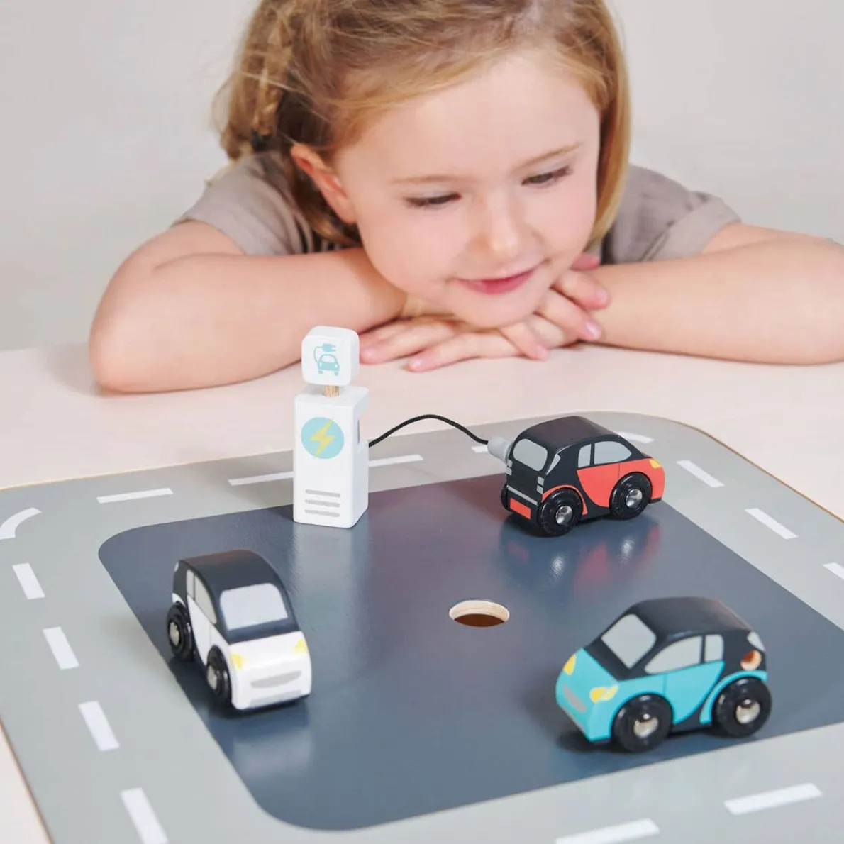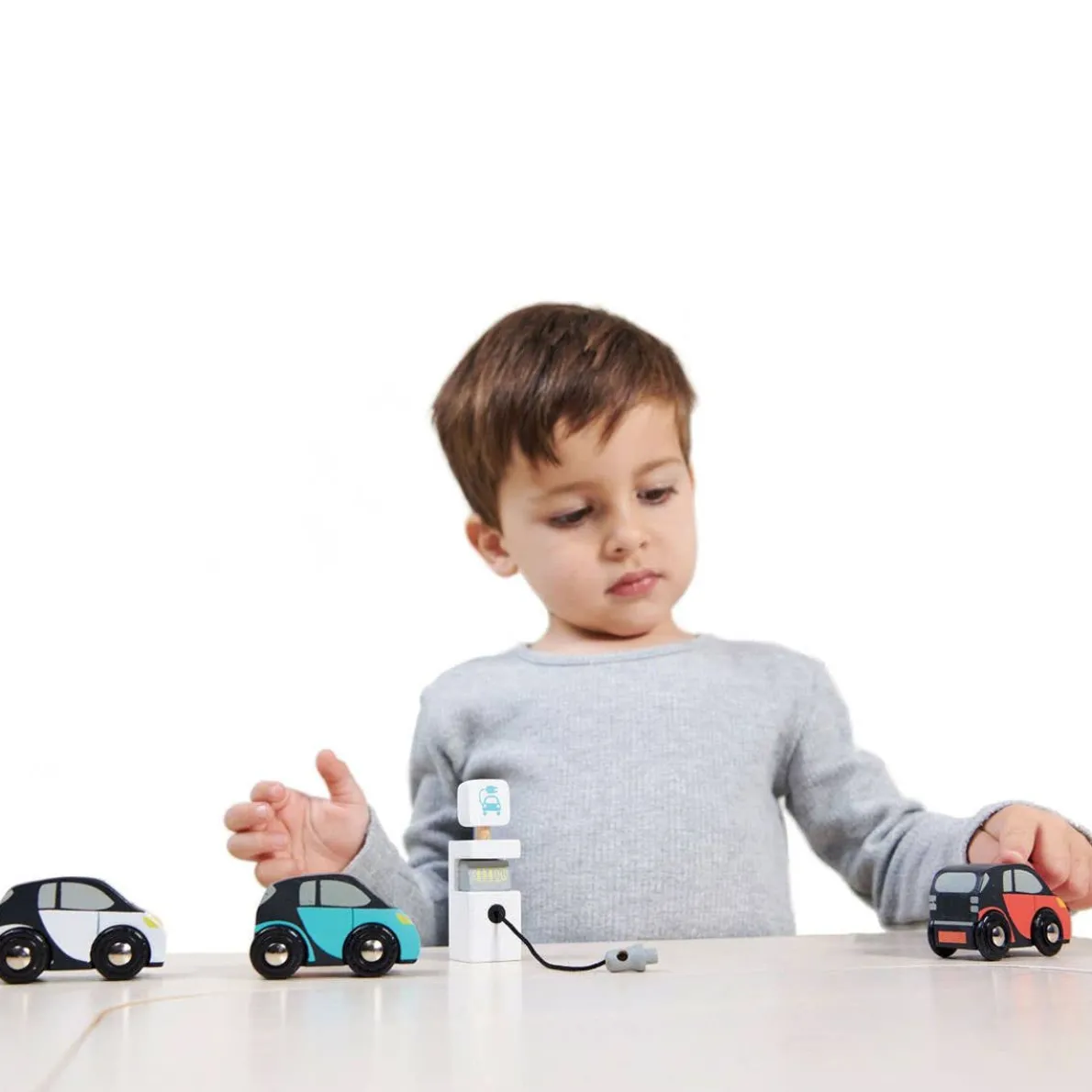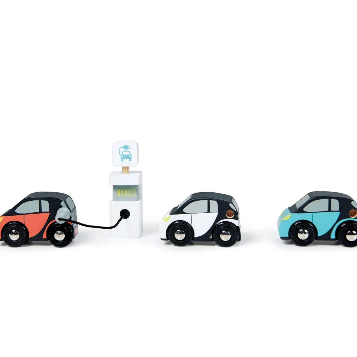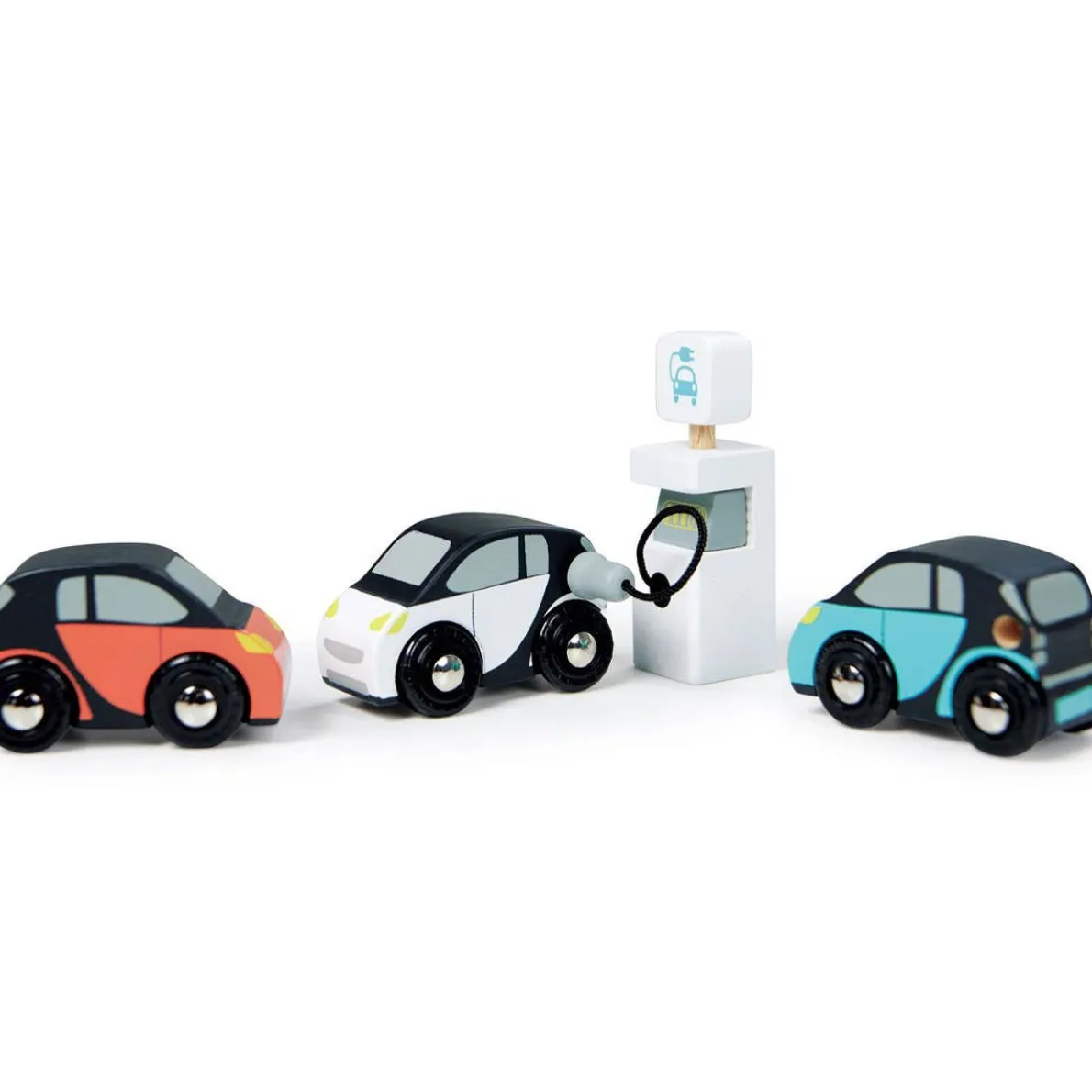 Embrace the future o f transport with this 3 electric smart car set and charging unit. Each car has a little hole to plug in at the charging point.