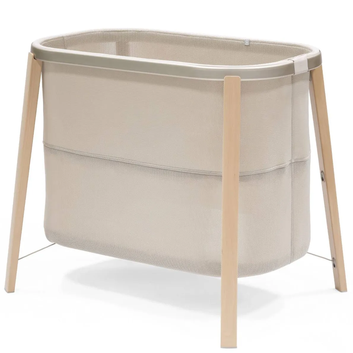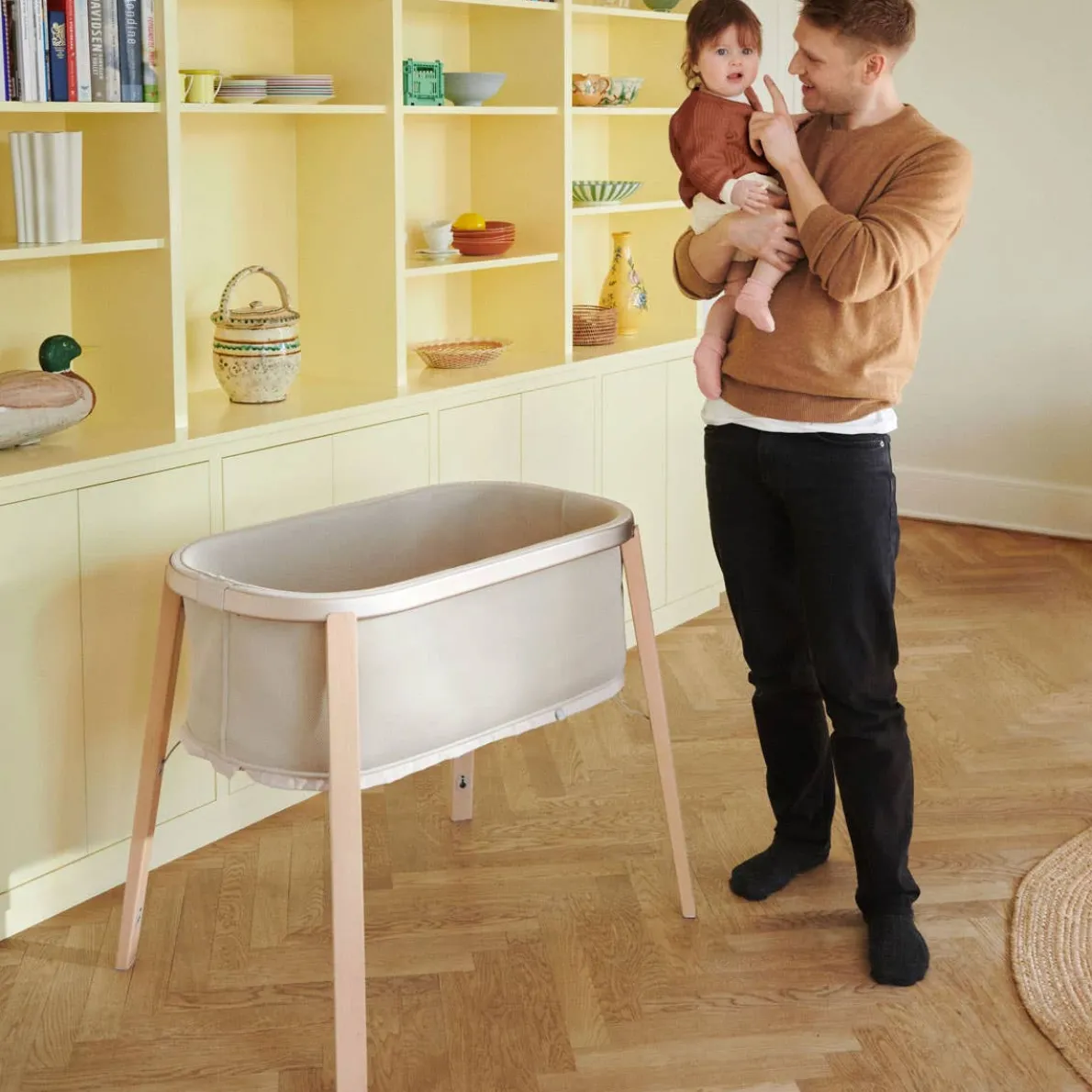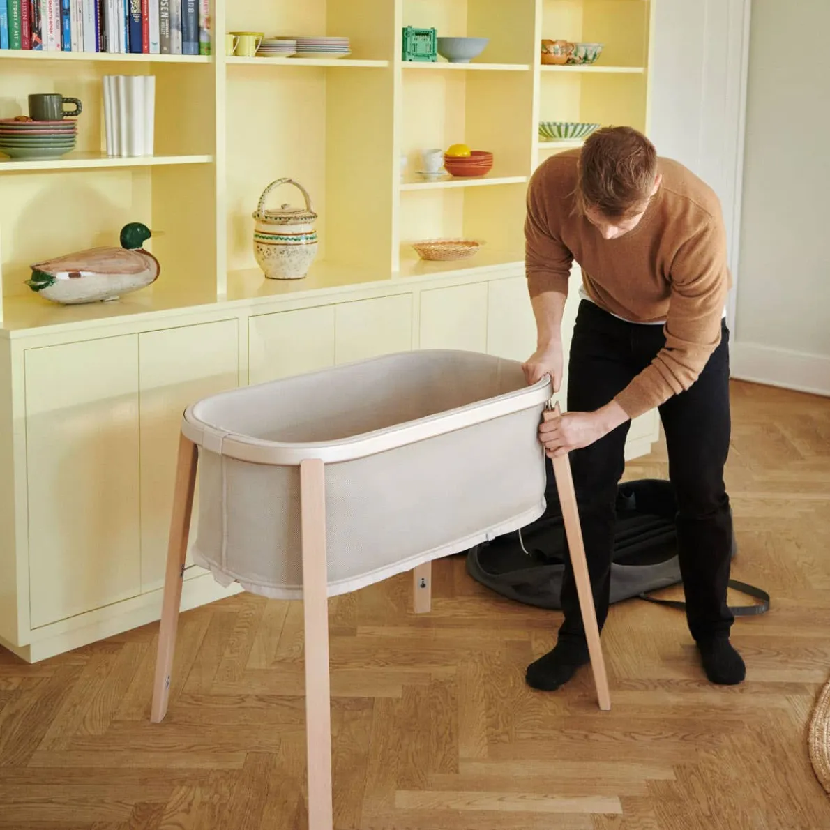 When your baby is so tiny and new, you want to keep them close to you. Looking for the bassinet of your dreams? Rest assured, this is it. Stokke has reinvented the bassinet with the new Stokke® Snoozi™. Airy and light with a soft oval shape, Stokke® Snoozi™ cradles your baby in comfort and can be used from birth to bring your baby near for bonding. The firm, comfortable mattress and breathable fabrics make it the perfect place for your newborn to rest, sleep, and nap… in every room of your home. Best of all, it even adjusts as your little one grows. Use the high newborn position for the first 6 months, then simply lower the mattress when your baby can pull themselves up and use it up until 9 months (15kg). Designed with premium materials including FSC®-certified wooden legs and a strong aluminum frame, Stokke® Snoozi™ also features main fabrics that are made of breathable 3D mesh materials that are gentle to the touch and machine washable. Available in two stunning neutral colors that suit any style or interior. For on-the-go families, the Stokke® Snoozi™ is also lightweight and assembles tool-free in only a few minutes, so it goes the extra mile and travels with you! Just use the optional travel & storage bag to pack it up for outings or holiday adventures.