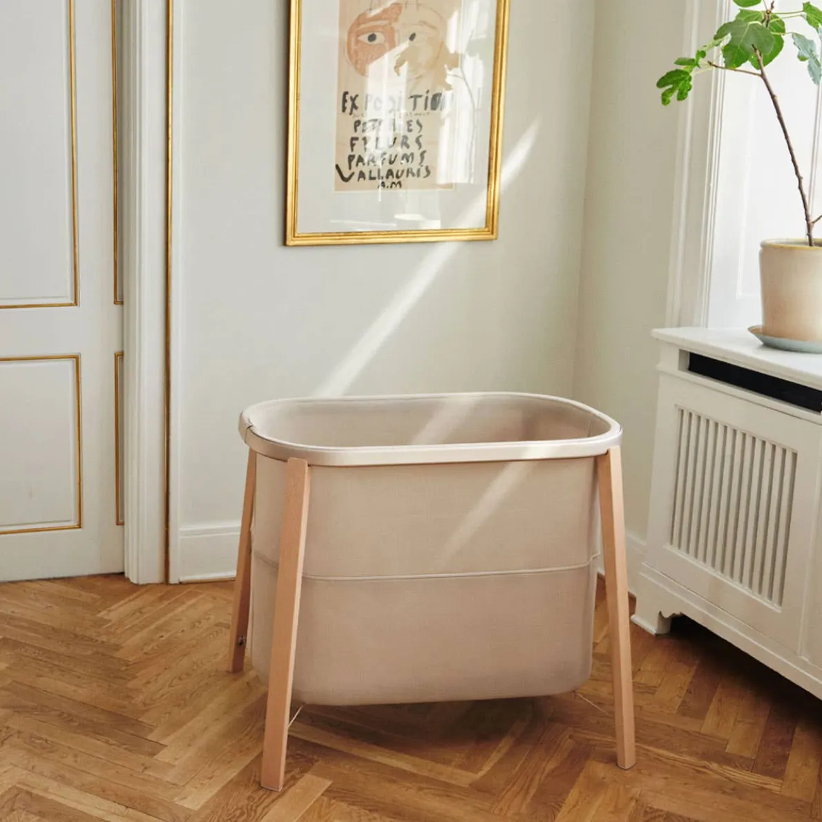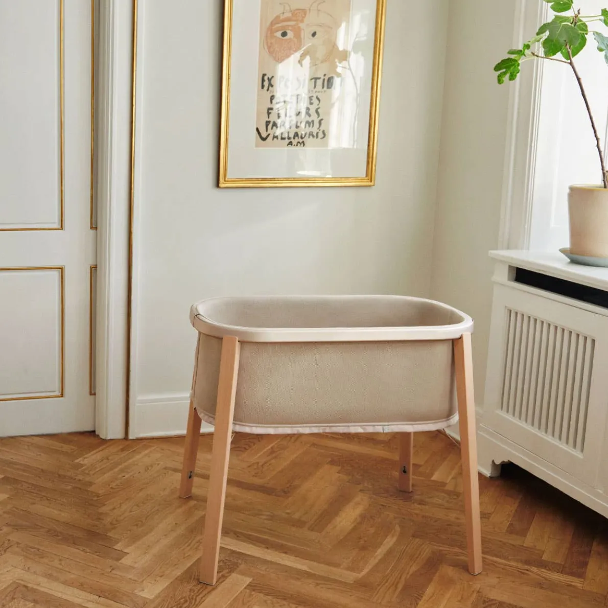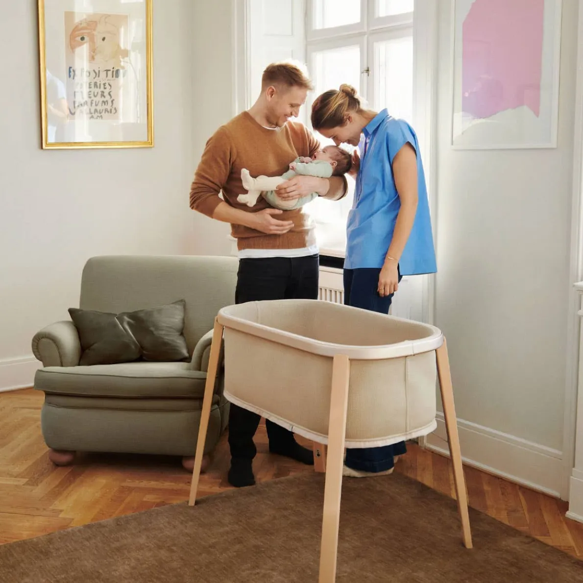 When your baby is so tiny and new, you want to keep them close to you. Looking for the bassinet of your dreams? Rest assured, this is it. Stokke has reinvented the bassinet with the new Stokke® Snoozi™. Airy and light with a soft oval shape, Stokke® Snoozi™ cradles your baby in comfort and can be used from birth to bring your baby near for bonding. The firm, comfortable mattress and breathable fabrics make it the perfect place for your newborn to rest, sleep, and nap… in every room of your home. Best of all, it even adjusts as your little one grows. Use the high newborn position for the first 6 months, then simply lower the mattress when your baby can pull themselves up and use it up until 9 months (15kg). Designed with premium materials including FSC®-certified wooden legs and a strong aluminum frame, Stokke® Snoozi™ also features main fabrics that are made of breathable 3D mesh materials that are gentle to the touch and machine washable. Available in two stunning neutral colors that suit any style or interior. For on-the-go families, the Stokke® Snoozi™ is also lightweight and assembles tool-free in only a few minutes, so it goes the extra mile and travels with you! Just use the optional travel & storage bag to pack it up for outings or holiday adventures.