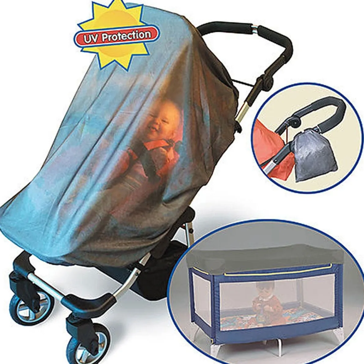 Jolly Jumper Solar Safe Net protects baby from harmful UV rays and pesky insects. This grey mesh cover allows air to flow freely while providing 85% UVB and 82% UVA protection, ensuring baby’s comfort while out in the stroller. The elasticized trim provides a snug fit around most strollers. When not in use, simply fold away into attached self-storage pouch.