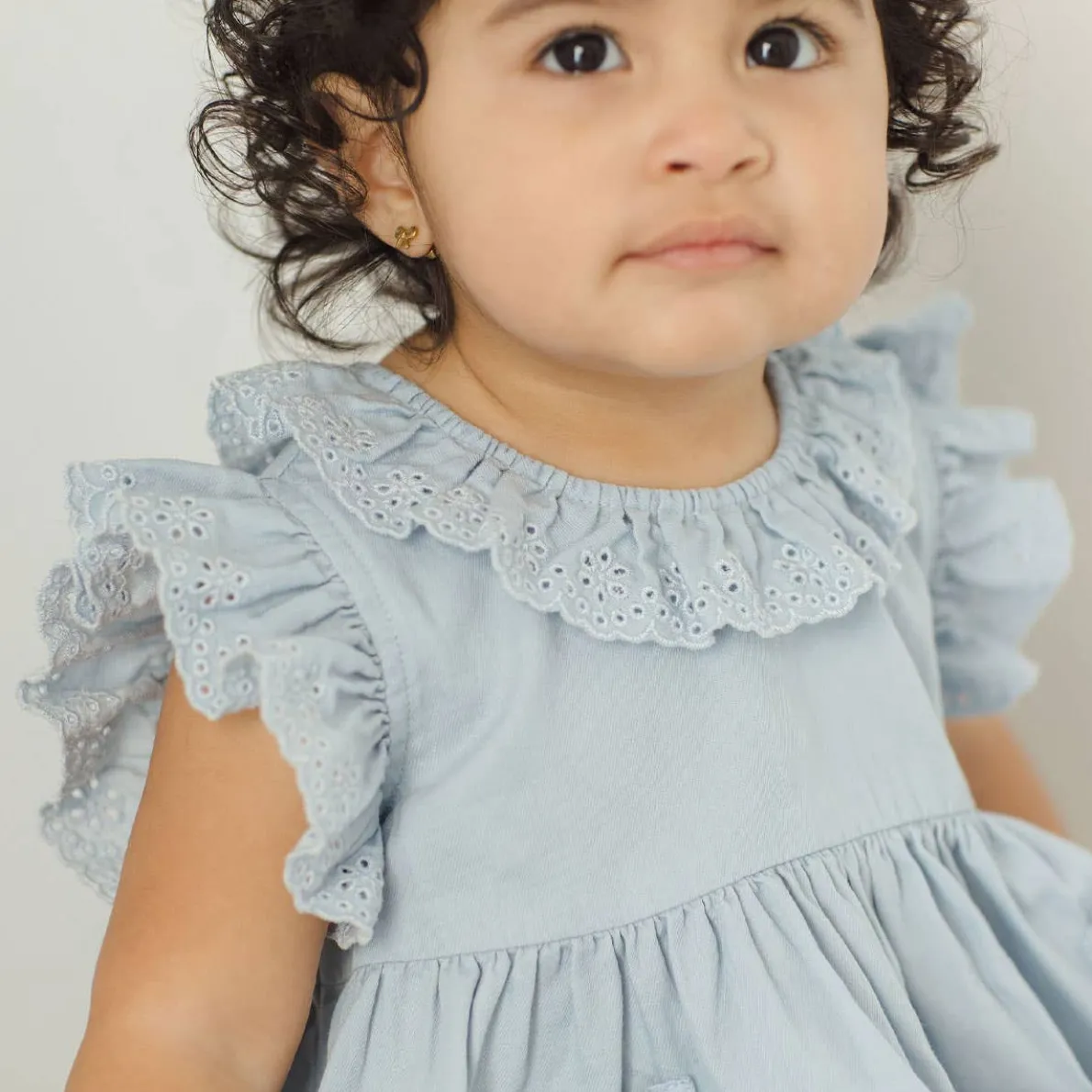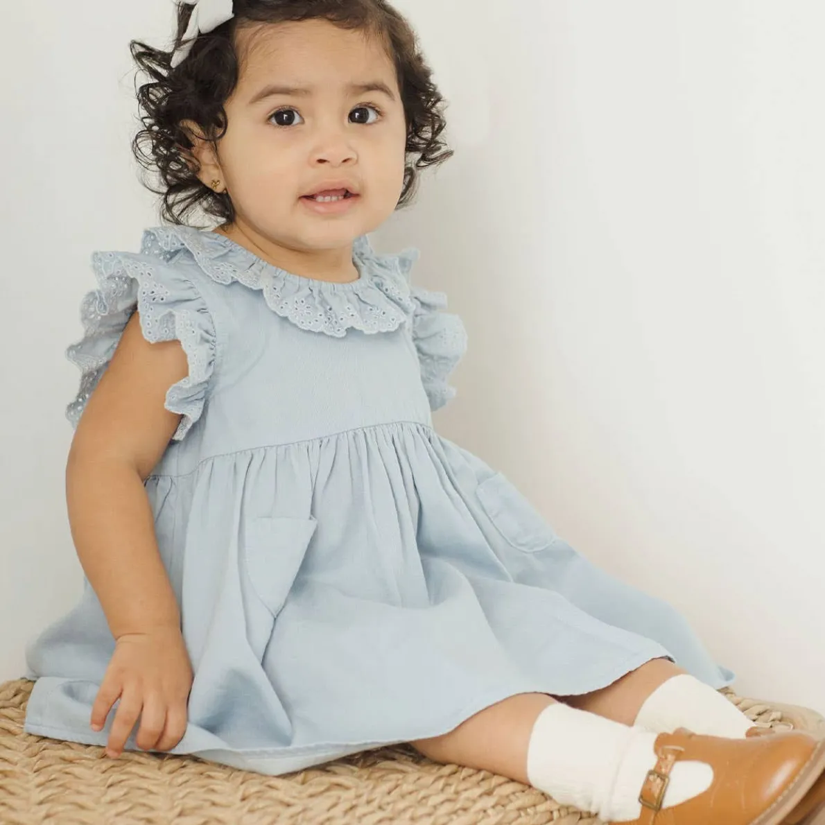 The Sophie Dress features a beautiful collar and ruffle sleeves with eyelet detail, and cute front pockets.