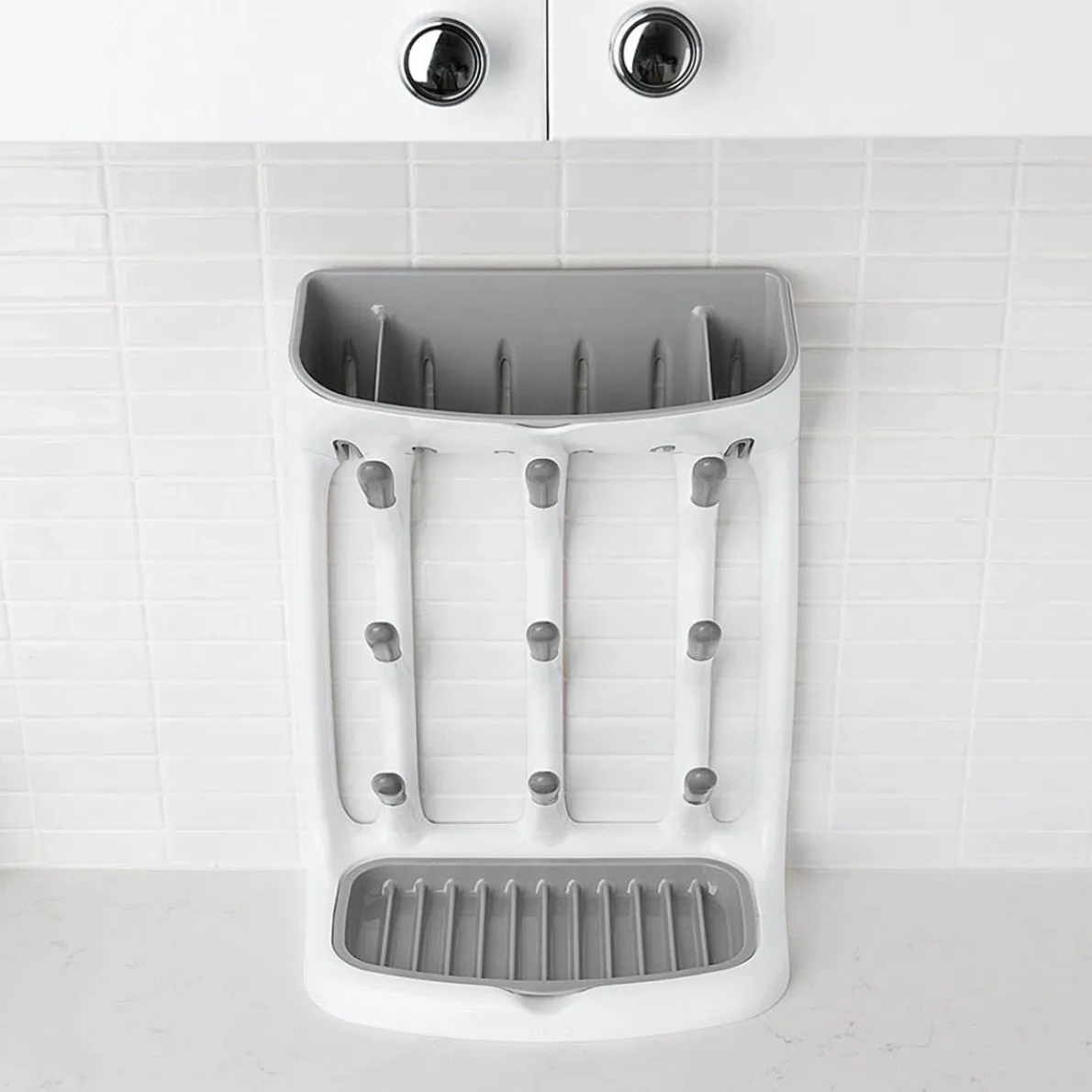 With a compact design that makes a big impact, the Space Saving Drying Rack will hold cups, bottles, and all their parts without cluttering the countertop. The angled pegs hold cups and bottles at just the right angle for thorough drying, while the top and base are perfect for drying small parts like valves, or even pacifiers. The Drying Rack fits neatly under cabinets, so it can be tucked out of the way against the wall. The base tray features ridges to keep lids and more elevated for quick drying, and both the base and top trays are removable for thorough cleaning.