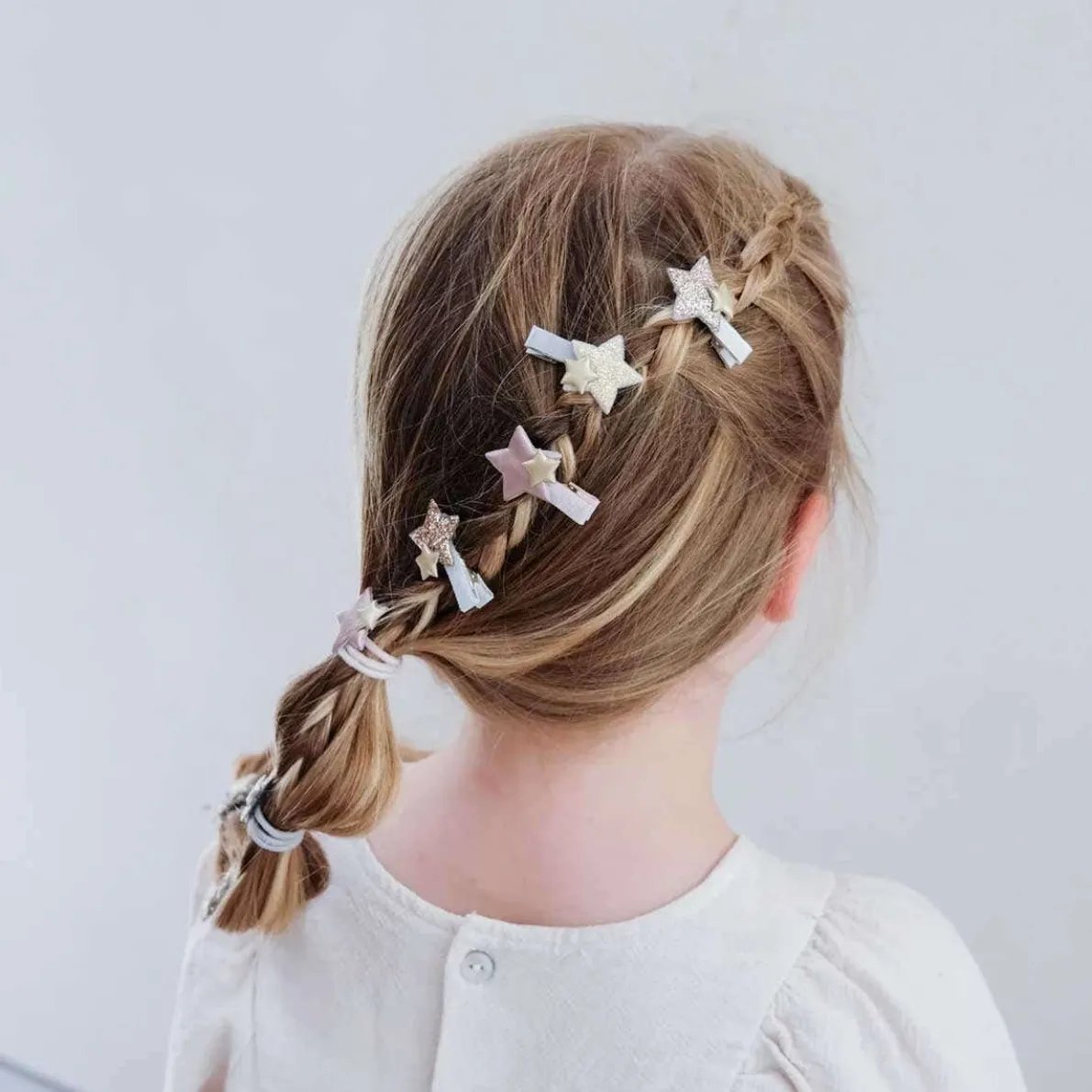 Add a little magic to their hair with our Sparkle star mini clips! Featuring layered stars in shimmering glitters and metallics, these clips are perfect for brightening up the festive season and any day after!