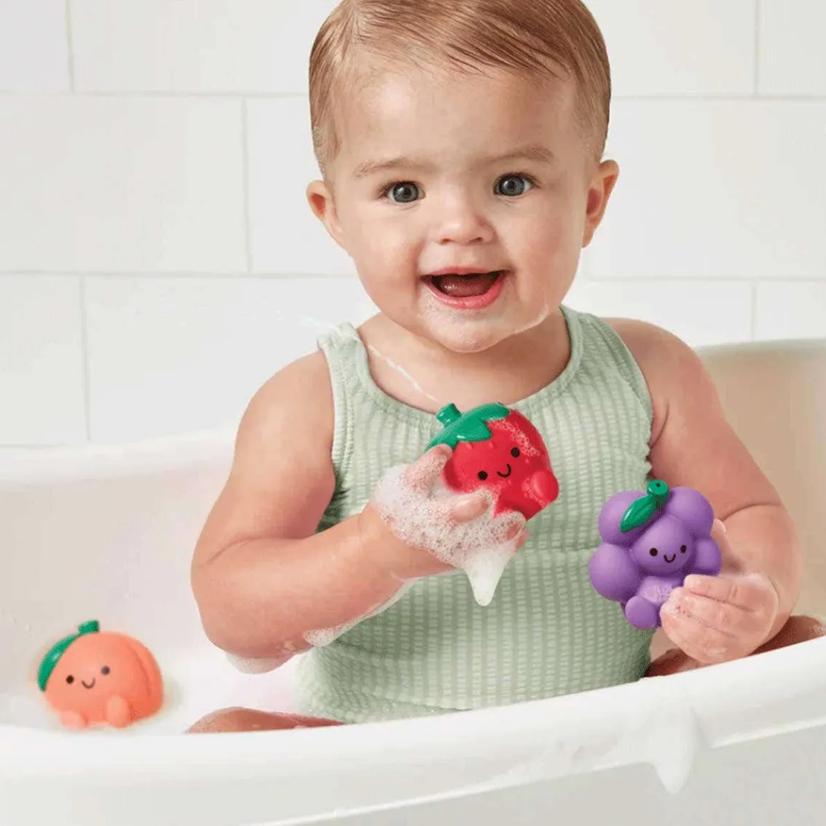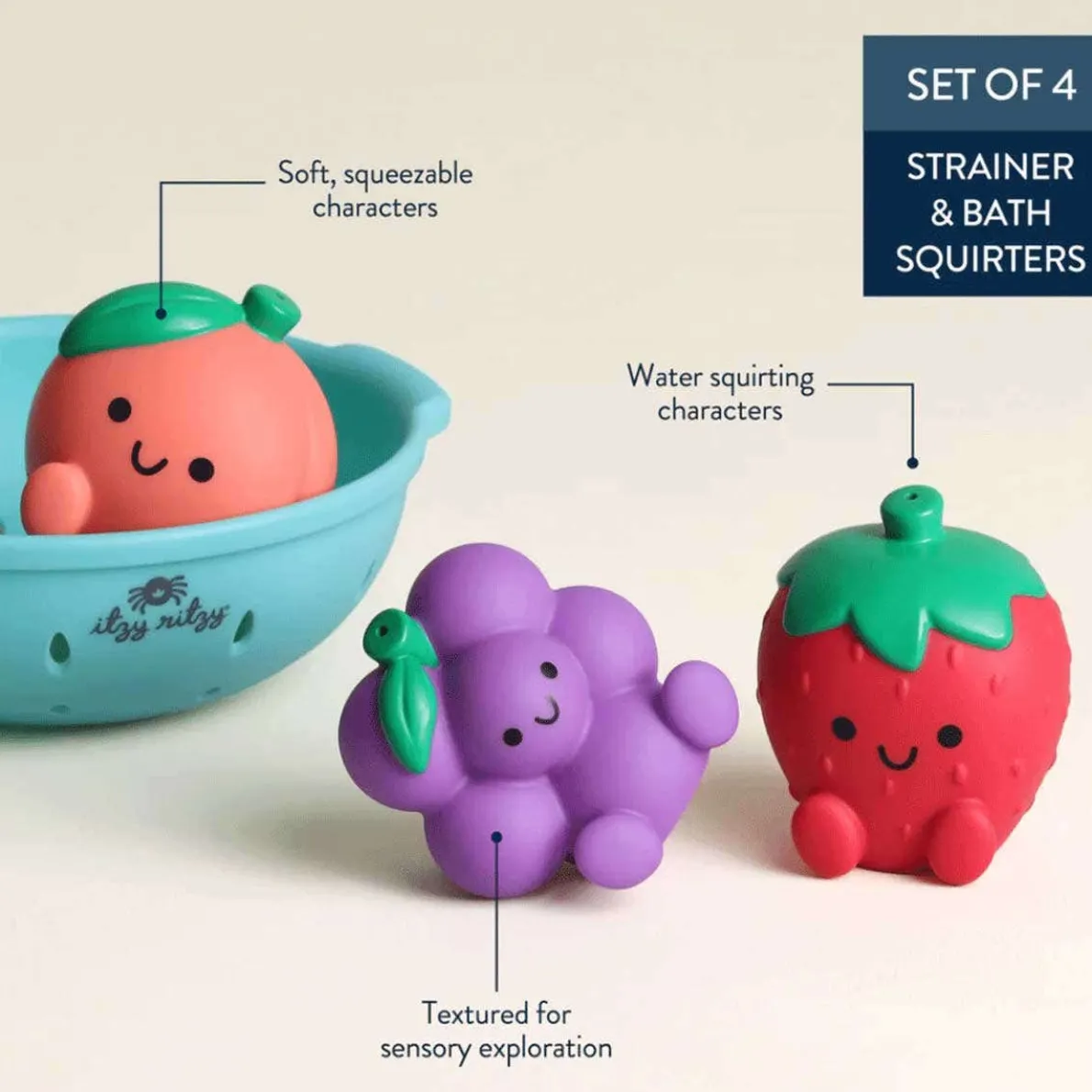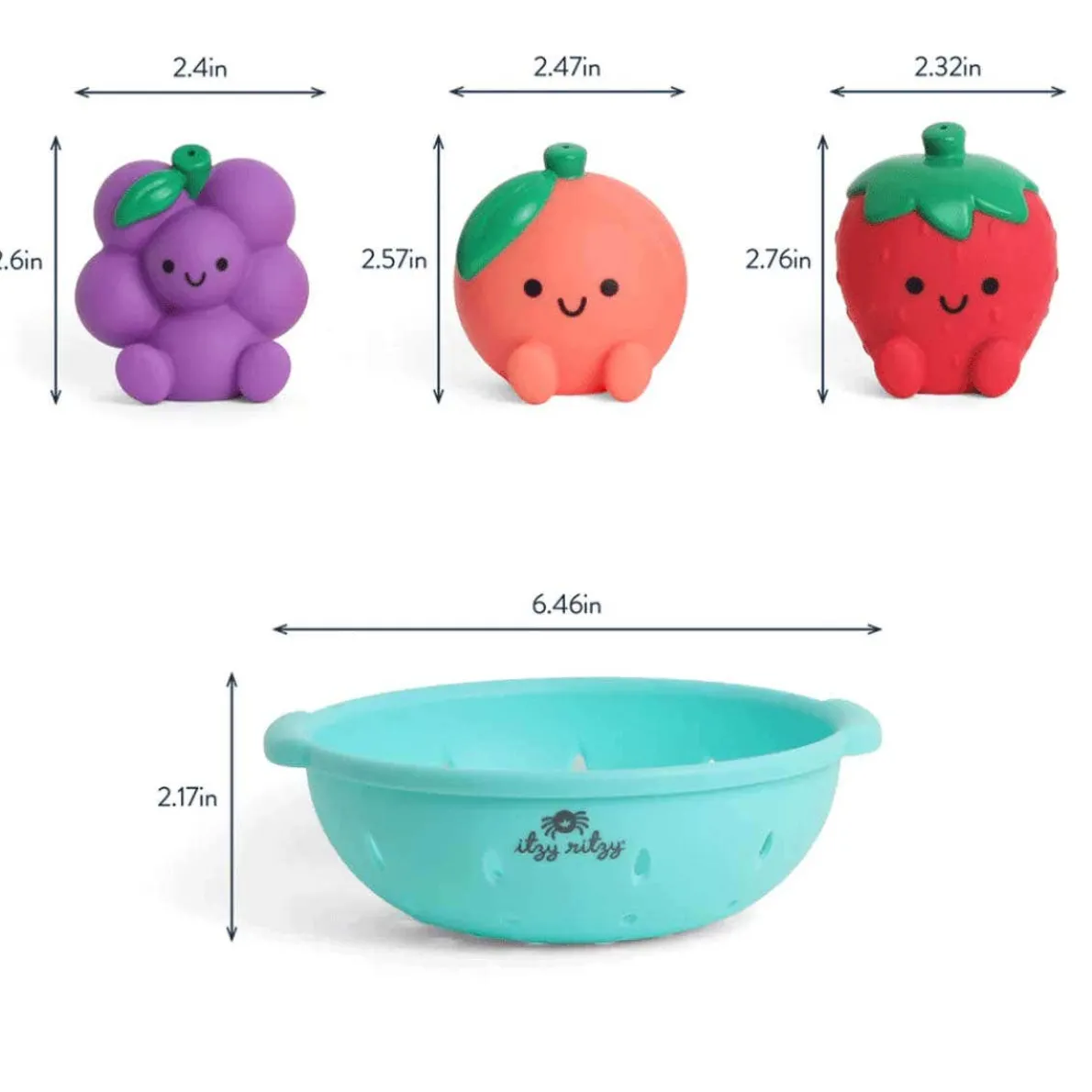 Squeeze in some fun! With Itzy Splash Pals™ bathtime play is overflowing with possibilities! These squeezable fruit-shaped squirties and sprinkle strainer encourage motor skill development and are great for creating endless bath time adventures!