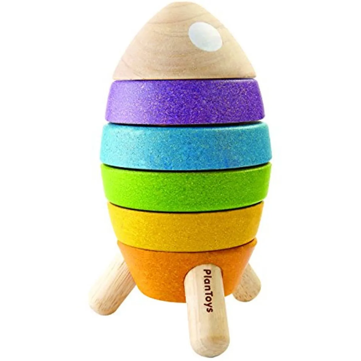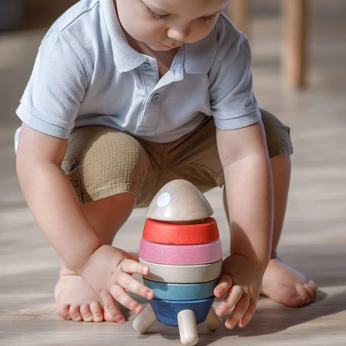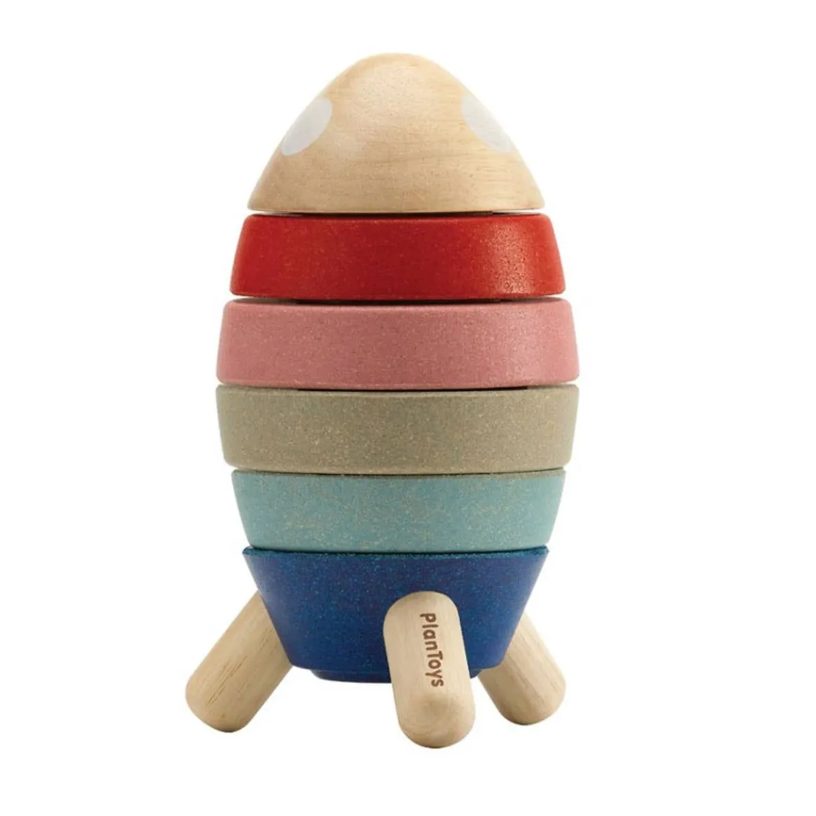 Build the PlanToys Stacking Rocket by stacking and matching the pieces in the correct order. Set the astronaut on the seat and start the countdown 3..2..1, lift off!