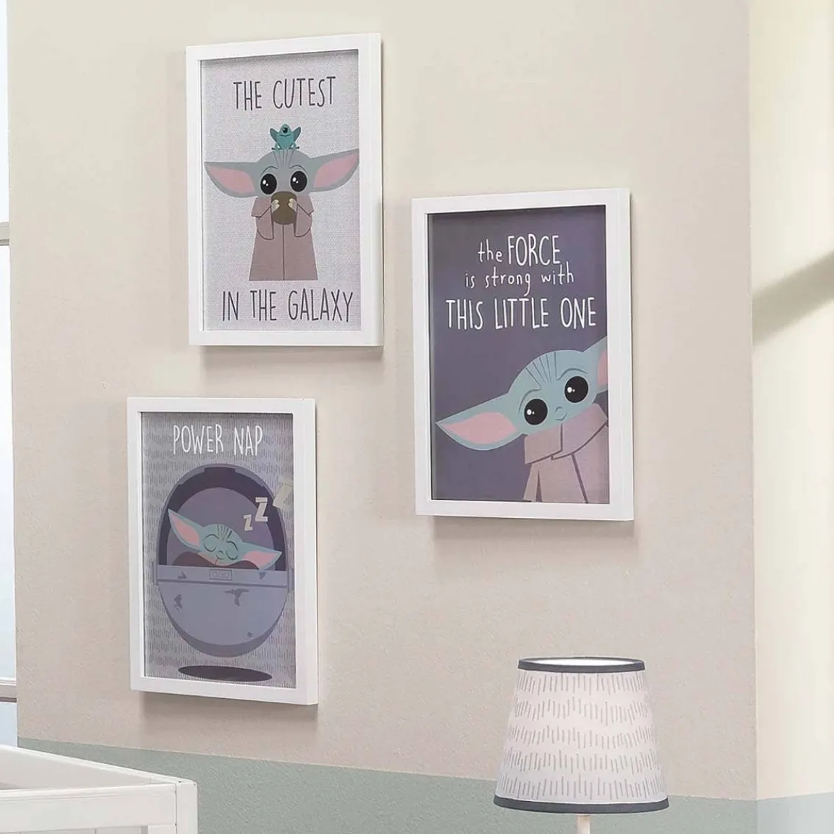This 3-piece set of printed unframed wall art is sized at 11” X 14” each. The first piece features The Child resting on the edge of his cradle pod with the words “ Power Nap” printed at the top. The second piece shows Baby Yoda / The Child standing and holding a bowl in both hands, while a small turquoise frog sits comfortably on his head. The quote says, “ The Cutest in the Galaxy”. The third piece of unframed wall art says, “The Force is Strong with this Little One”. Baby Yoda / the Child is dressed in his sandy taupe colored robe and is featured in the lower right corner. These prints will make a great feature wall in your child’s room. You can frame them (as shown) or stick them up directly on the wall (frames and sticky dots are not included).