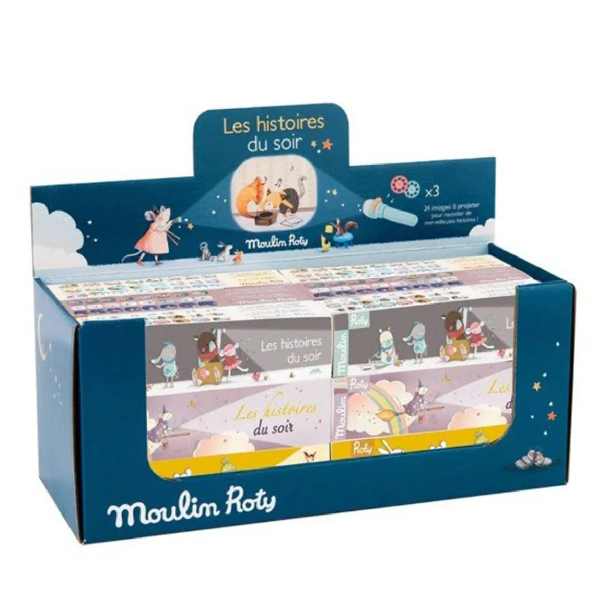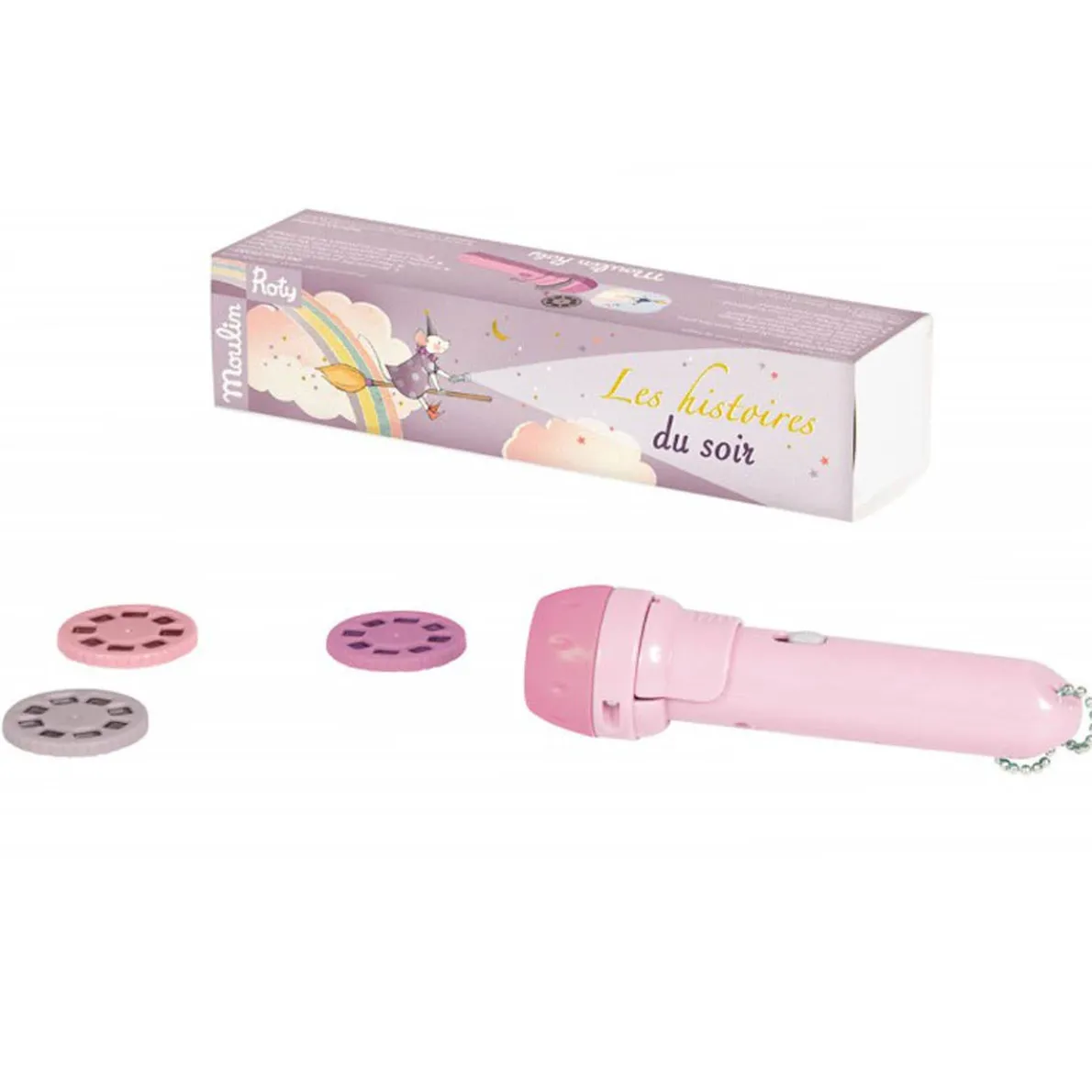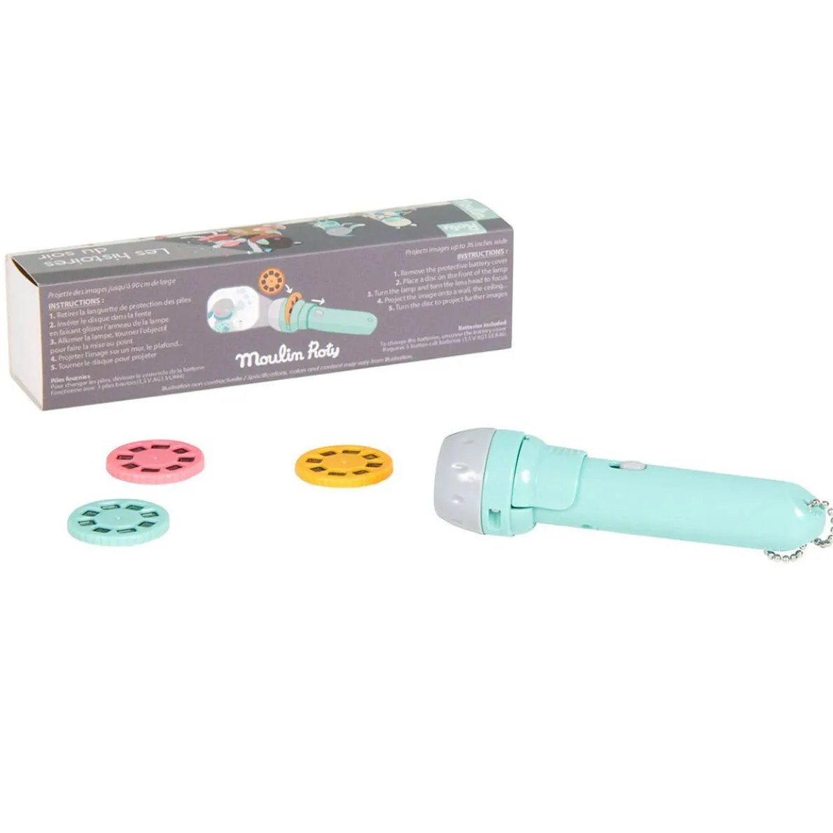 Moulin Roty Storybook Torches encourage the fine art of story-telling. Simply insert a colorful story disc into the flashlight, dim the lights and shine the projected image onto a flat surface. Children and parents alike will enjoy creating a narrative for the adorable scenes that appear. This creative flashlight comes with 3 disks and contains 24 different images. The Storybook Flashlight comes in a cute case and projects images up to 3 feet wide.