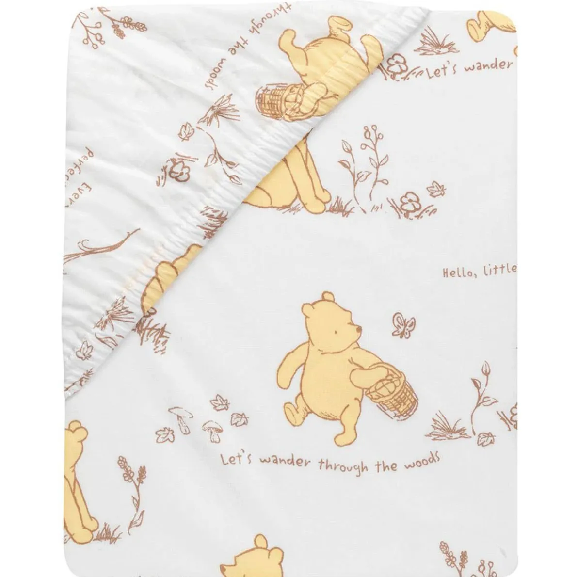 This breathable 100% cotton fitted crib sheet features Classic Pooh in a variety of poses. Winnie the Pooh is holding his favorite honey pot, interacting with a squirrel and a dragonfly, and wandering through the woods. The crib sheet has elastic all the way around ensuring a safe and secure fit on a standard-sized crib mattress measuring 28” X 52”.