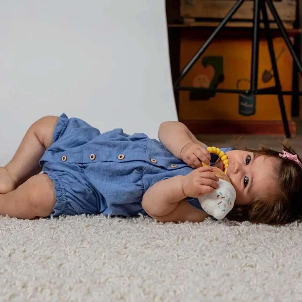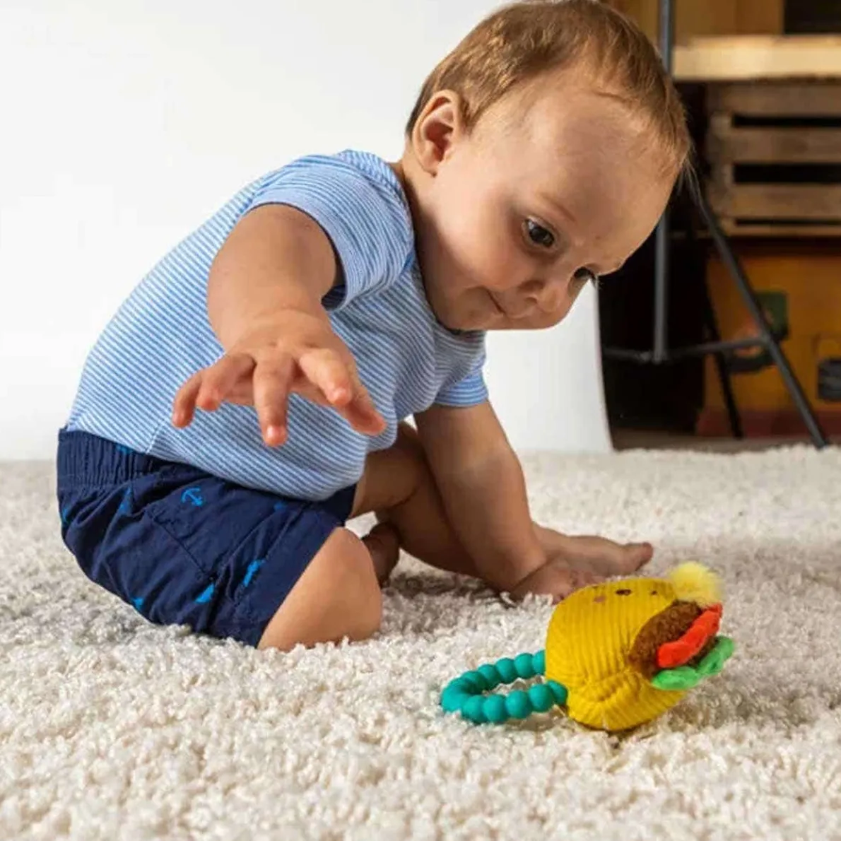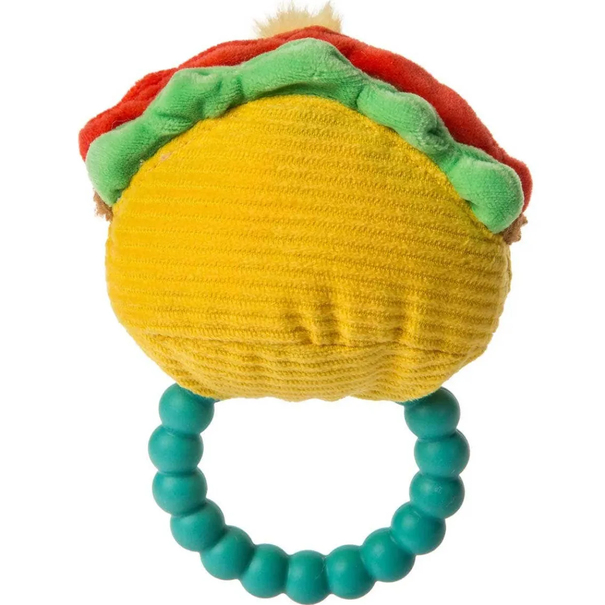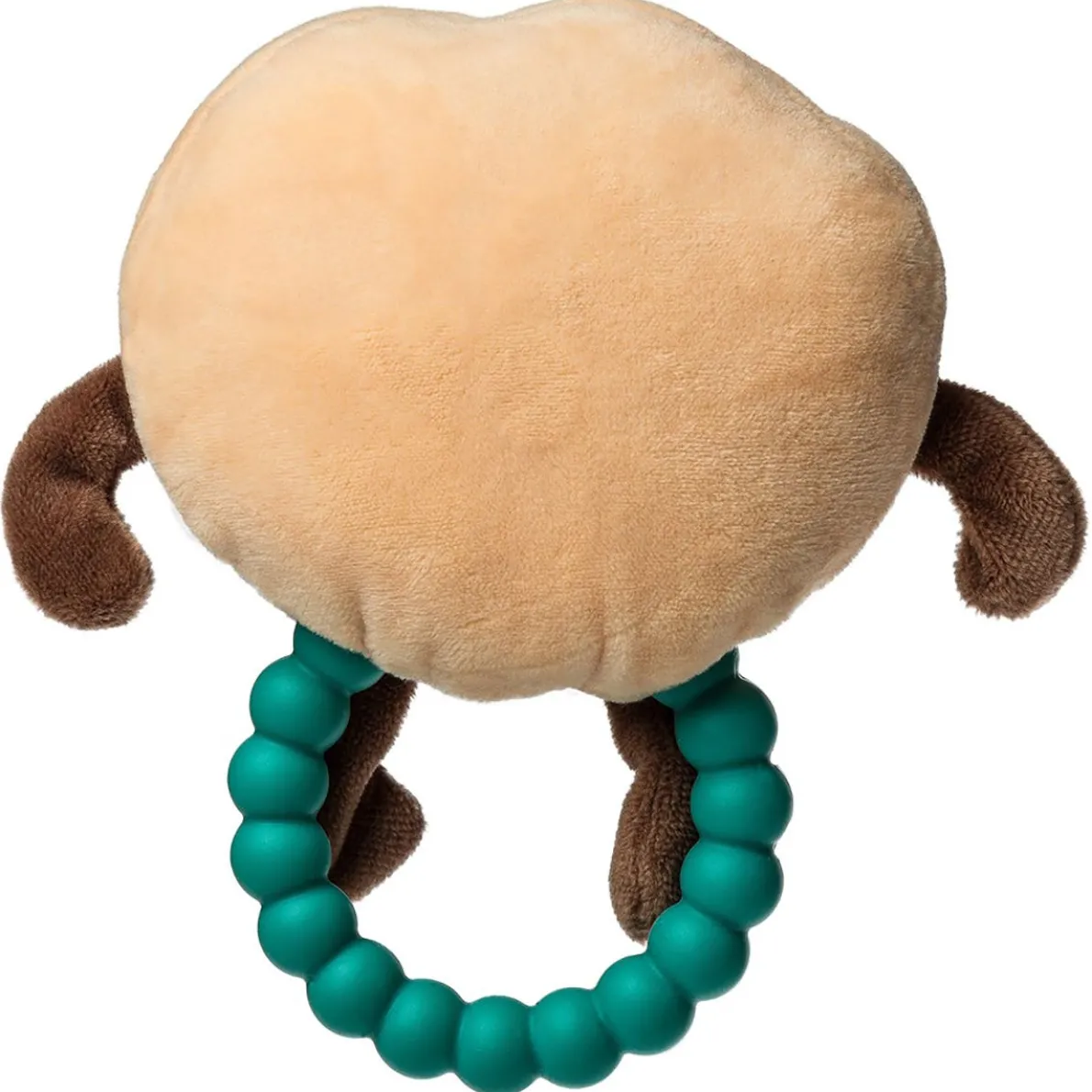 - Bead-like one-piece silicone teether sewn-in