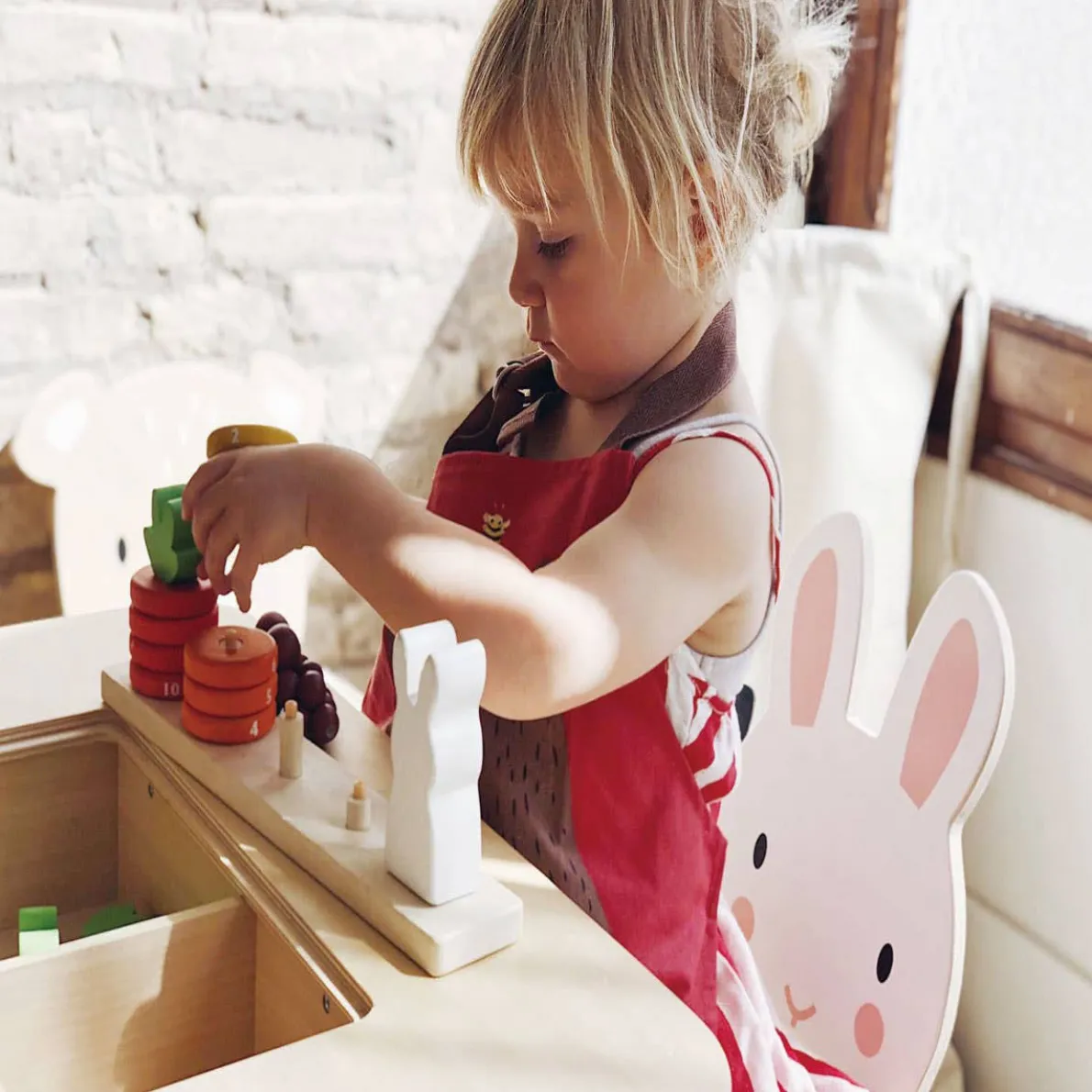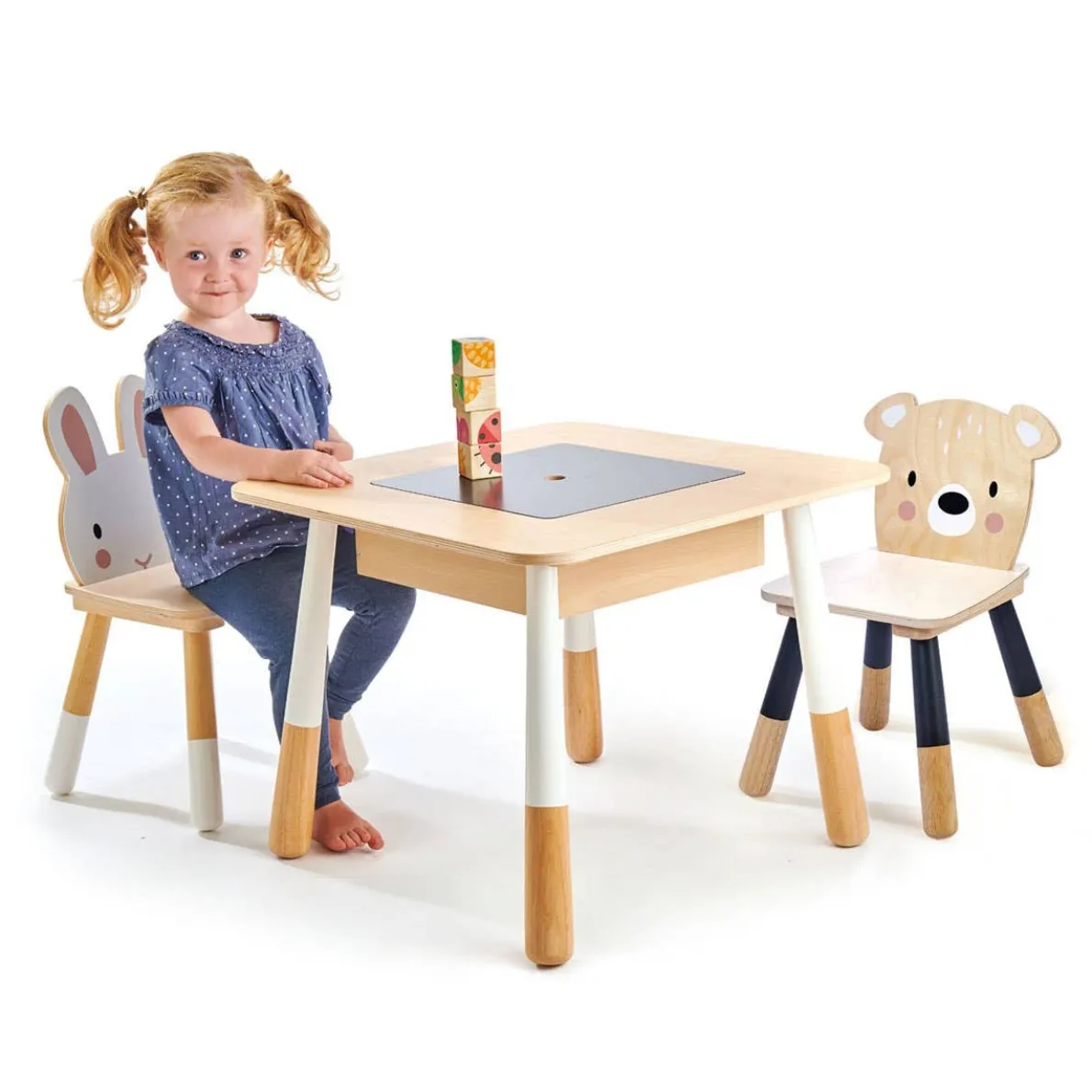 A stylish plywood table with a hidden compartment for crayons etc. under a chalkboard central panel. 2 plywood chairs, rabbit and bear themed.
