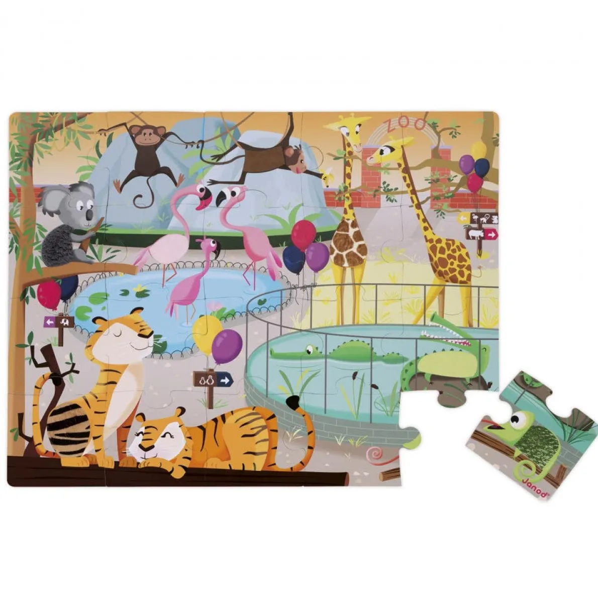 Giant 20-piece puzzle in rigid cardboard, with 7 pieces with textures. Illustration with bright colors on different themes. Poster included. Pack: Gift box with some textures on the lid.
