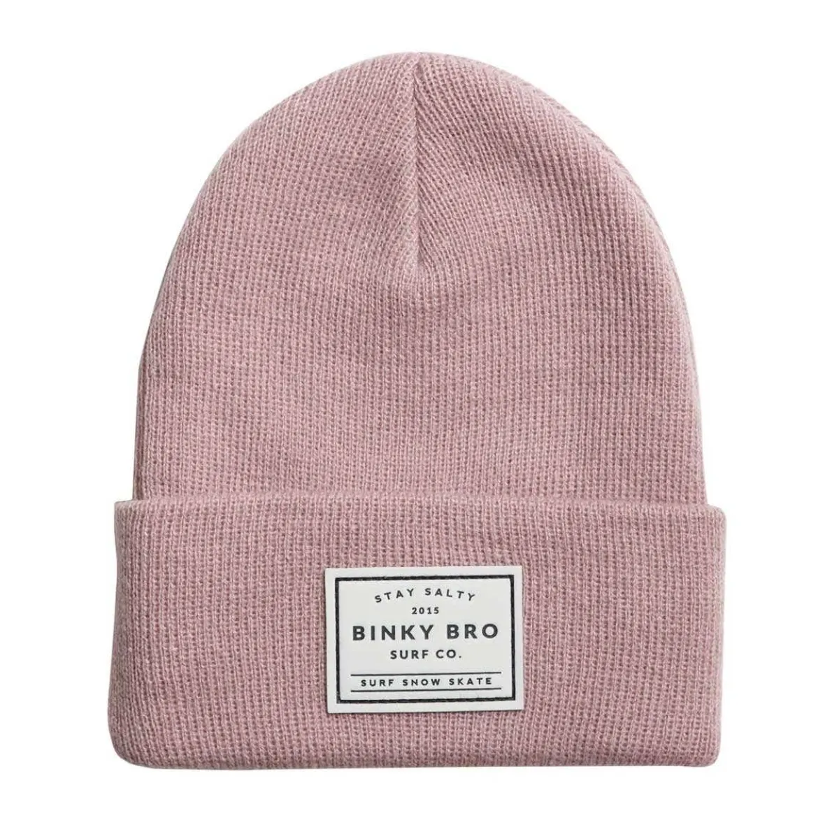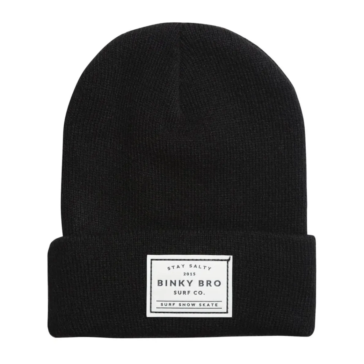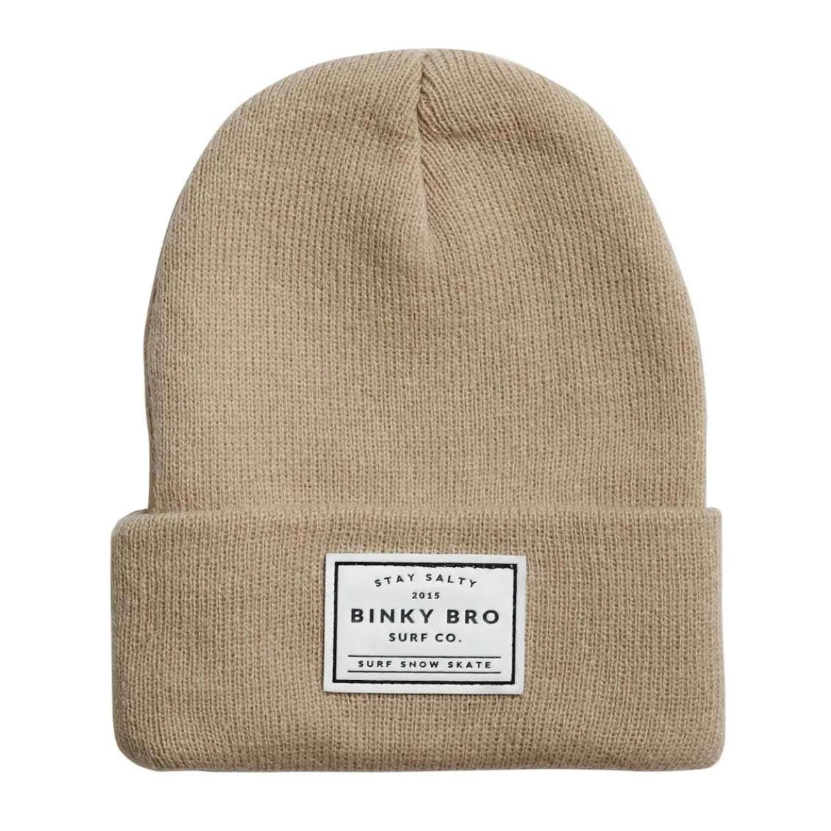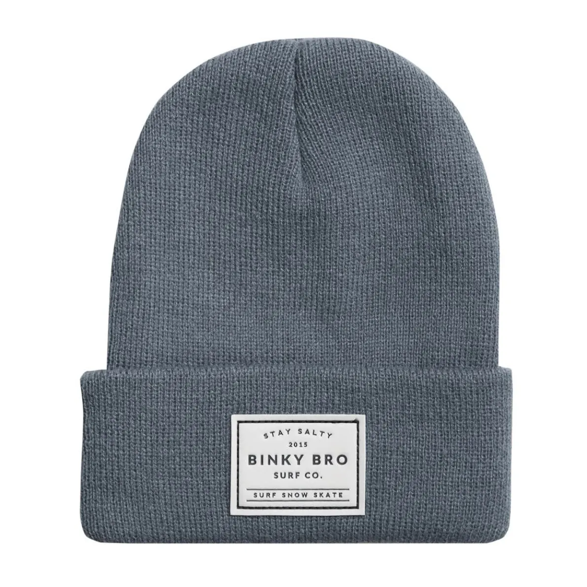 The Tahoe beanie is 100% acrylic. It has a “BinkyBro Surf Co–Surf|Snow|Skate” embossed patch on the front. Sizes are currently available in newborn, infant, toddler, youth, and adult.