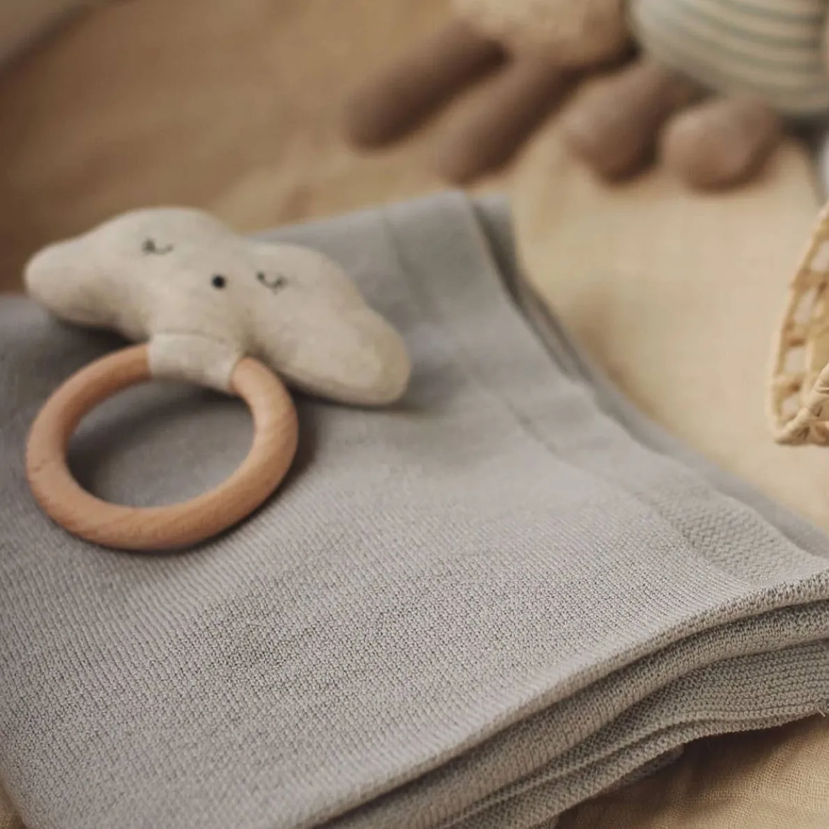 Made from knitted cotton with a silver sparkle, this sweet little blowing cloud makes a lovely toy for little hands to play with. The smooth natural wooden ring will satisfy your little one’s need to gnaw down when those teeth are moving, and the rattle inside give this a fun, interactive element.