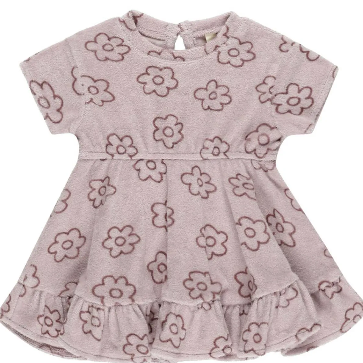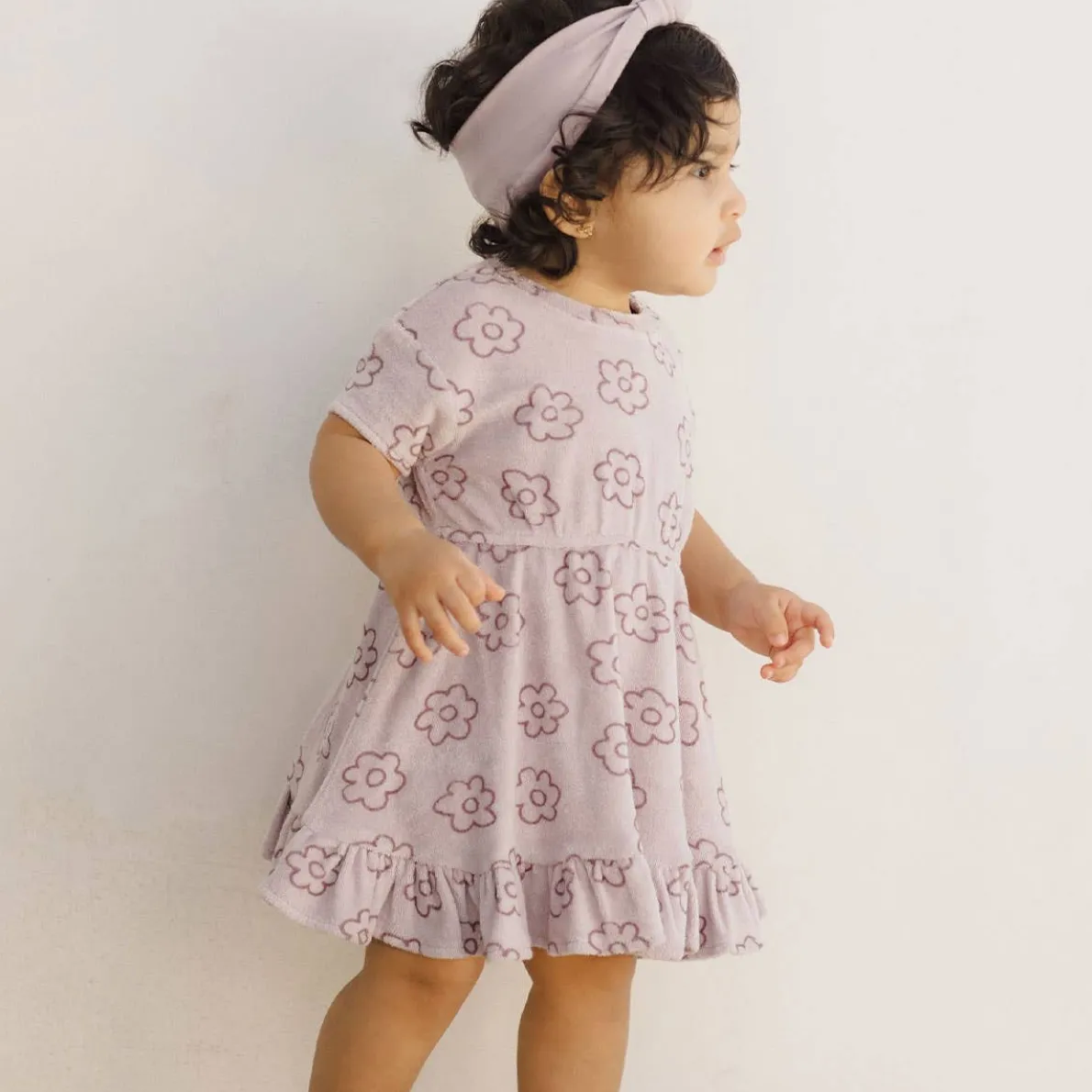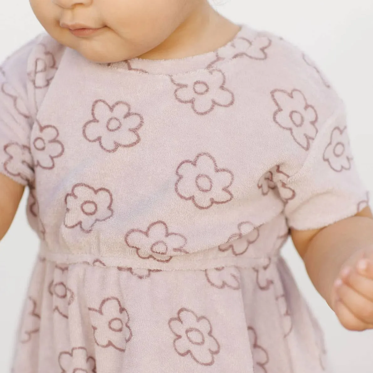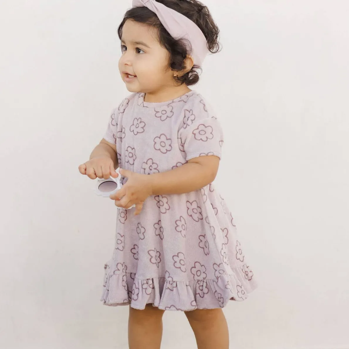 This sweet dress made of terry cloth fabric features ruffle trim, an elasticized waist, and a button keyhole closure for the perfect fit. Coordinating bloomers included with all sizes.