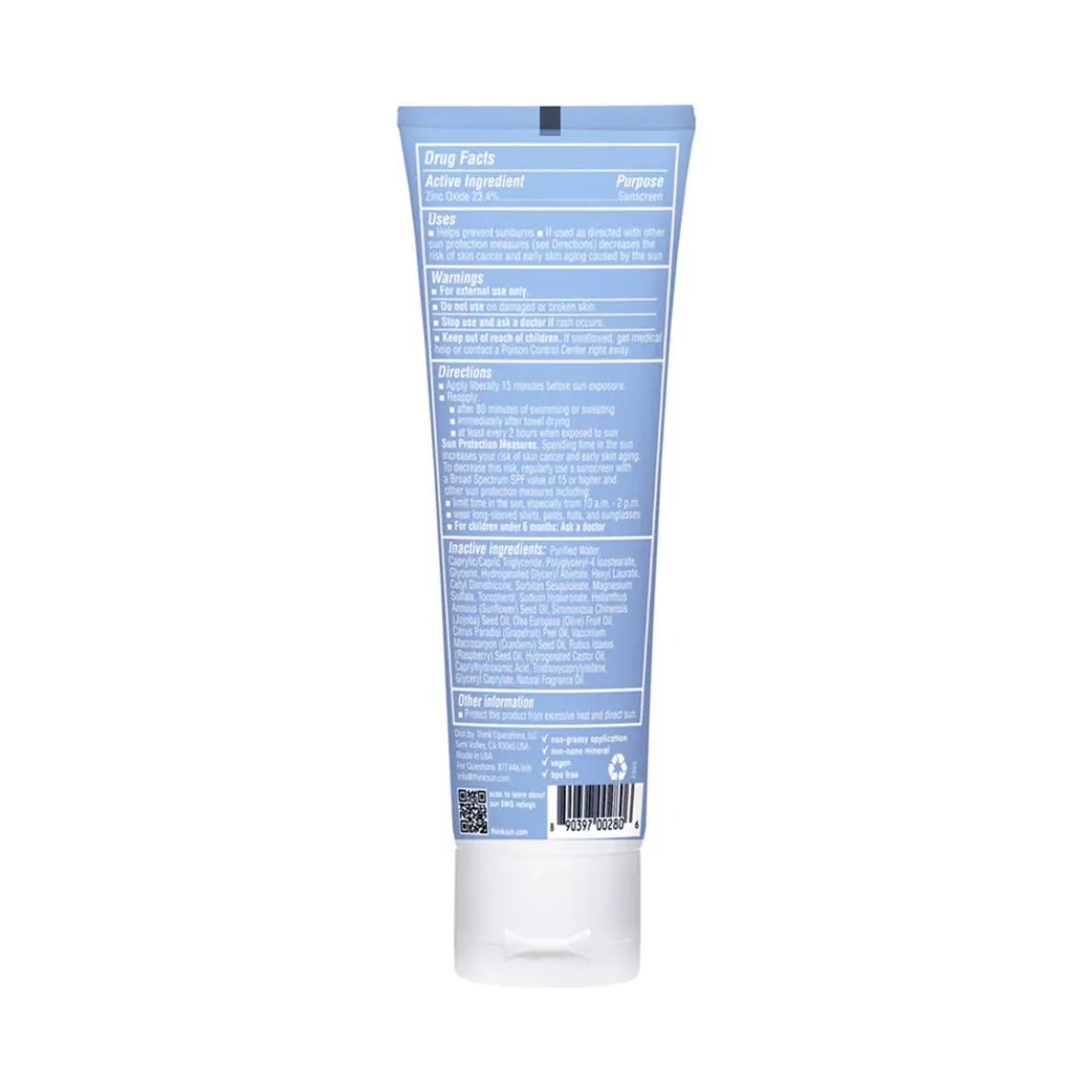 Thinksport sunscreen is highly effective, falls into the highest category for water resistance and has a sensible SPF 50+ rating. Thinksport sunscreens utilize average zinc oxide particles greater than 110nm. Physical (or mineral) sunscreens work by protecting the skin with a physical barrier on top of the skin. Mineral sunscreens contain an active ingredient of either zinc or titanium oxide. Thinkbaby sunscreen has the active ingredient of zinc oxide.