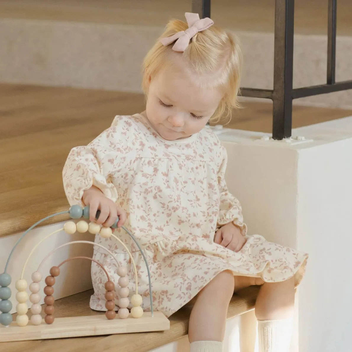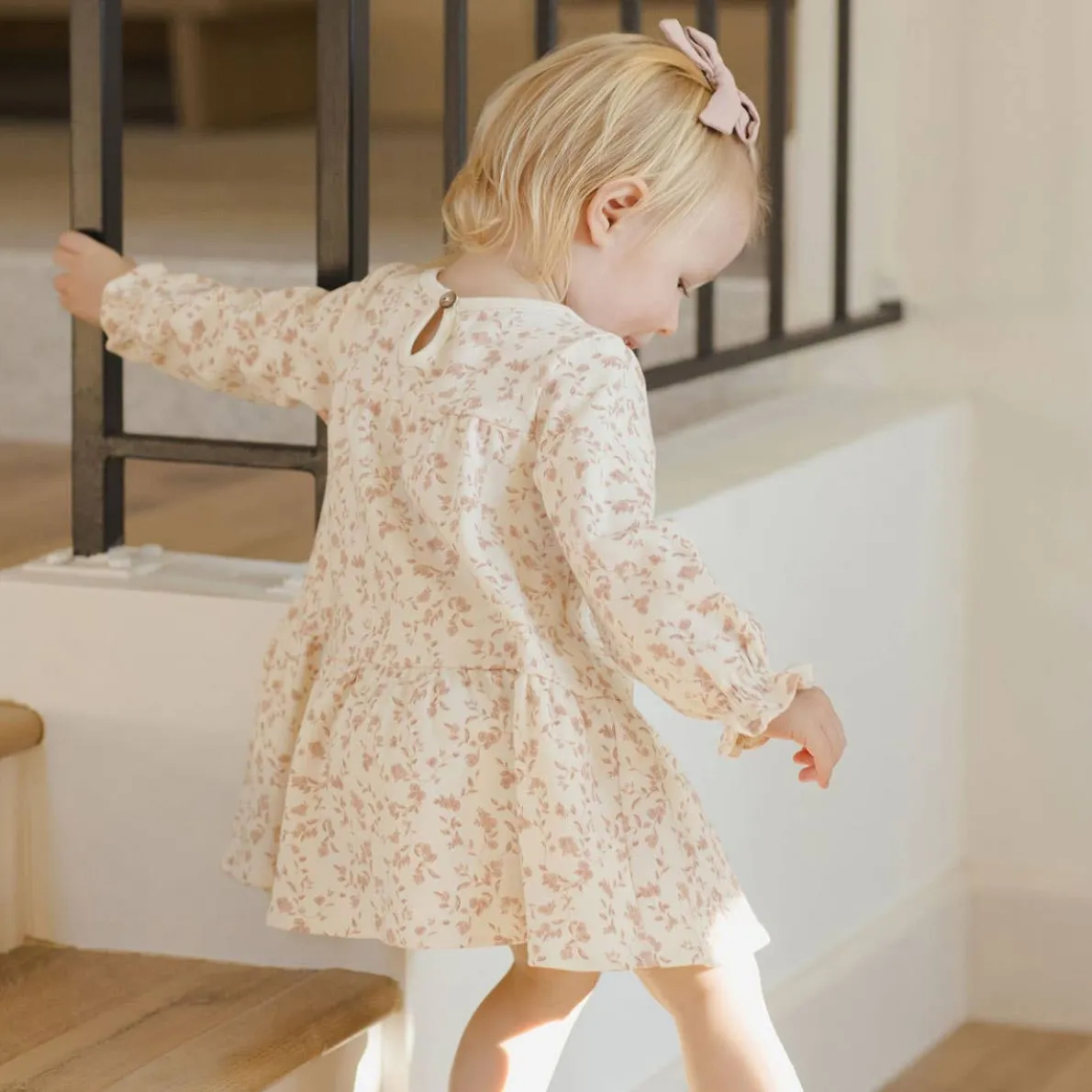 Long sleeve dress featuring soft tiered layers and a coconut button closure at the back. Coordinating bloomers included with all sizes.