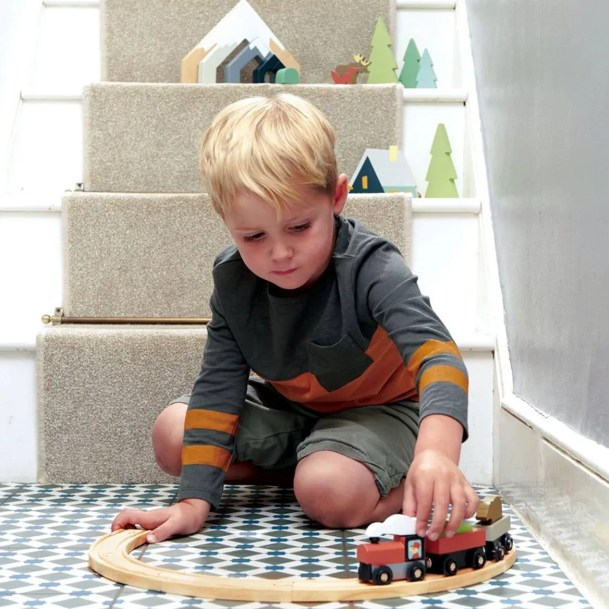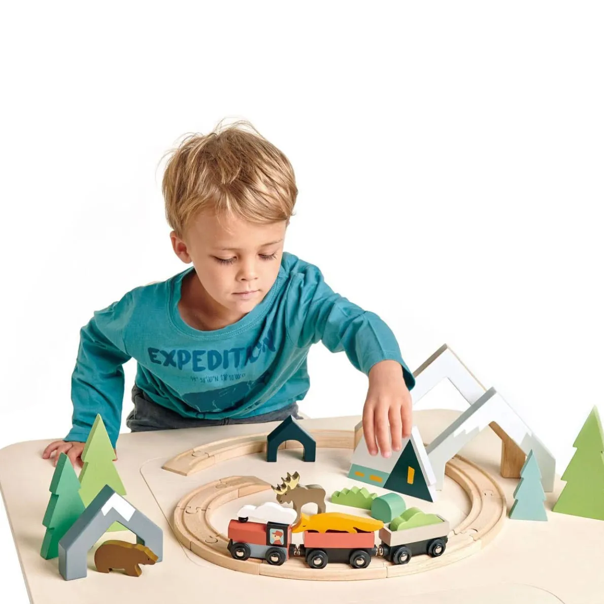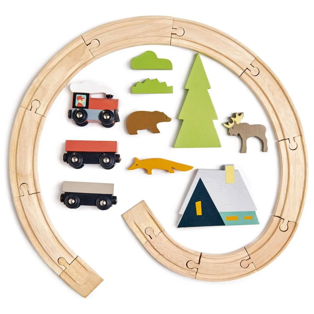 Take the train with its 2 carriages on a mountain trail to see a bear, moose, and fox. Balance the animals on 2 grassy parts, the fir tree or the cosy alpine chalet.