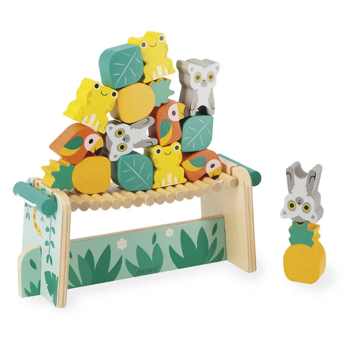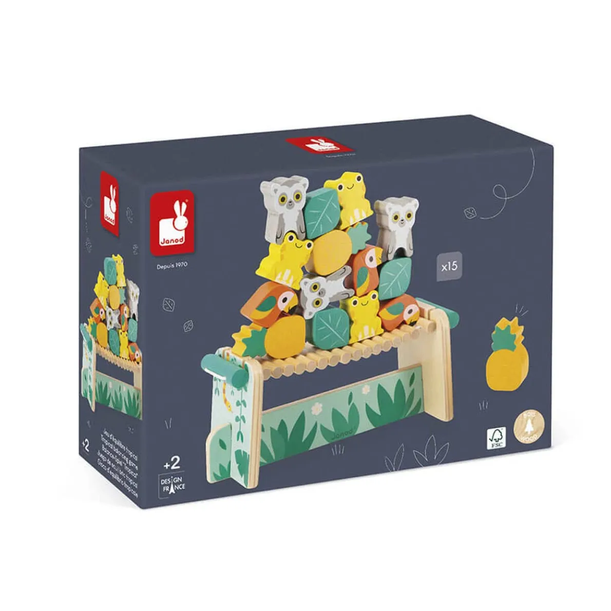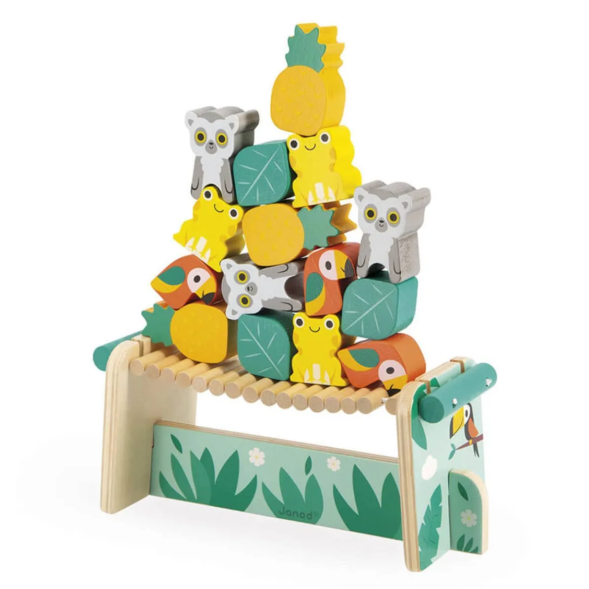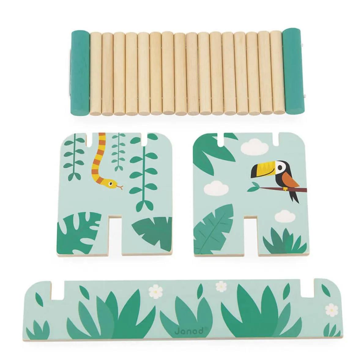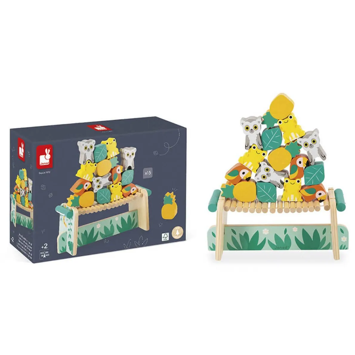 Will there be room for everyone on the suspension bridge? This wooden monkey bridge in the heart of the rainforest is ready to accommodate a host of animals who wish to cross! Frogs, lemurs and parrots, but also leaves and pineapples will have to find their balance in this colourful game of skill. First assemble the bridge in 3 parts, then have fun alone or with others stacking the elements without making them fall! A wooden balancing game for children aged 2 and over. A total of 15 pieces to be stacked, which will help baby develop dexterity and concentration: they will have to be meticulous and patient to keep all these funny animals on the bridge! This early learning toy is made of wood from sustainably managed, FSC®-certified forests. Water-based paint.