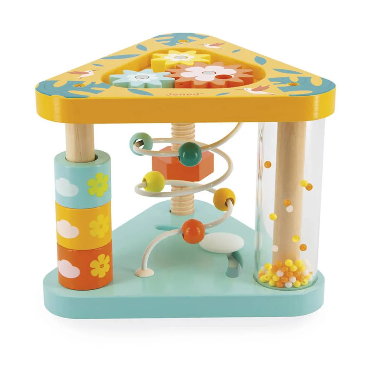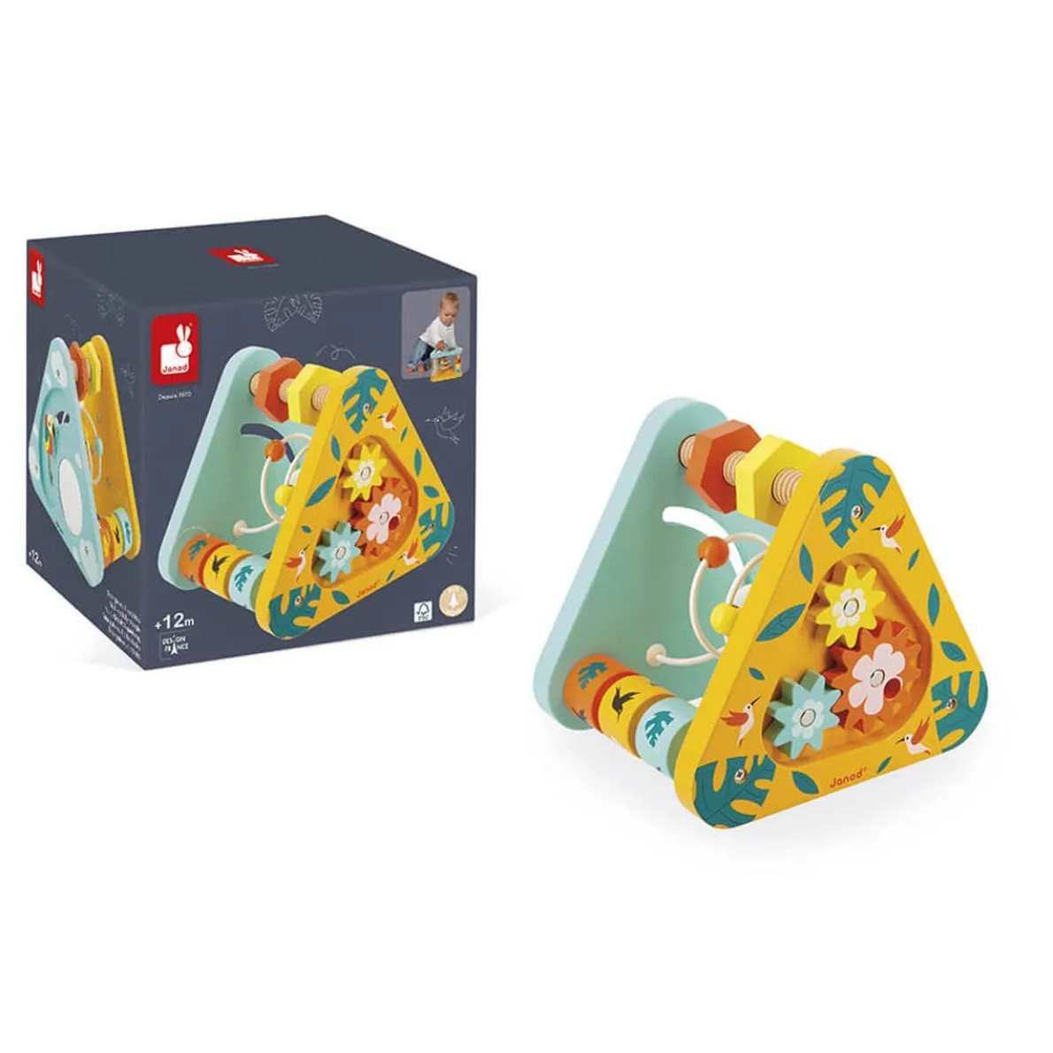 Multi-activity and vibrant triangle! This early learning toy promises many new discoveries for baby. With 7 activities: Maze, mirror, gears to turn, nuts to screw, abacus, rain stick and cylinders to align, this wooden toy is ideal for children from 12 months. Compact, this comprehensive toy is easy to carry around and for the child to handle. Children from the age of 1 will be able to develop their fine motor skills, their coordination and become familiar with colours and shapes! With a multitude of activities on each side, baby will always be discovering new things! This wooden early years toy is made from water-based paint and wood from sustainably managed, FSC®-certified forests.