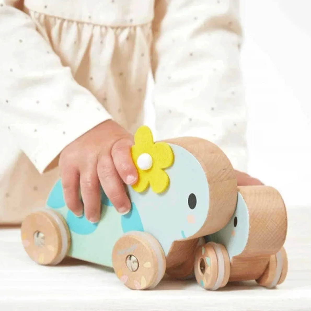 Big turtle and little turtle are out! Ideal for little toddlers from 12 months, this walking toy features an adorable duo of wooden turtles. Their rounded shape and 5 cm width make them easy for little ones to hold for long walks! Baby will love rolling these two new friends side by side. It’s also a great early-learning toy for entertaining two children at the same time: each to his own turtle! The large turtle features a pretty felt flower on its head, for an interesting tactile touch to browse. Another plus: the silicone coating on the wheels keeps them quiet! With these wooden walking toys, babies can develop their motor skills and imagination: what adventures will our two turtles embark little ones on today? From Pure collection of wooden early-learning toys, this set of 2 rolling turtles is made from FSC™-certified wood