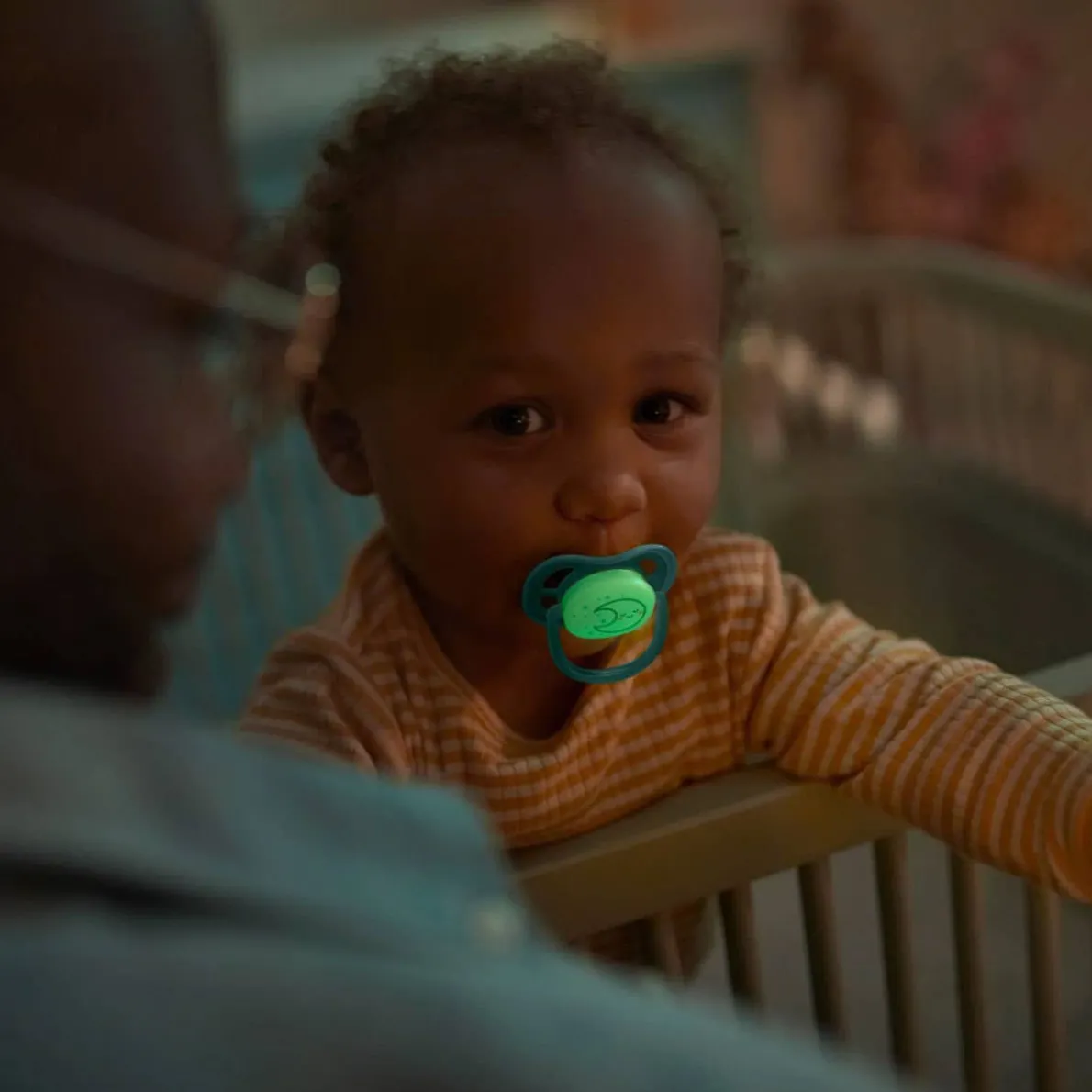 The Philips Avent Ultra Air pacifier for babies 6-18 months has a long lasting glow, so it’s easy to find in the dark. It’s designed with a lightweight, breathable shield for baby’s sensitive skin. Four (4) extra large holes in the shield allow for maximum air flow, so skin stays drier while soothing; 84% of moms agree!* 98% of babies accept the nipple**, so you can feel confident with this choice. Comes with 2 pacifiers packaged in a sterilizer / carrying case that can be used to sterilize them with water in the microwave and transport them. *MetrixLab Home Placement Test with 118 U.S. moms, 2017 **98% of moms say their babies accept the textured nipple in our ultra air and ultra soft pacifiers, independent research, USA, 2016 – 2017