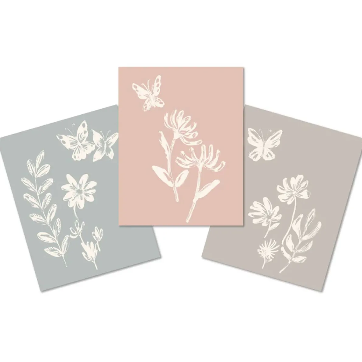 Lambs & Ivy artist designed these three custom watercolor prints in Baby Bloom. These prints are a great way to decorate a feature wall in your child’s room. They are professionally printed on 300 gsm card stock and are perfectly sized at 11” X 14” each to create a stunning décor when hung on a wall together. Each print depicts flowers and butterflies on a different color ground. You can frame them or hang them directly on the wall. Frames and sticky dots are not included.