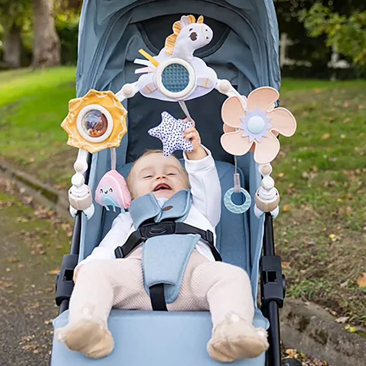 - Clever stroller toy with engaging activities and a flexible design that adapts to baby’s age and stage!