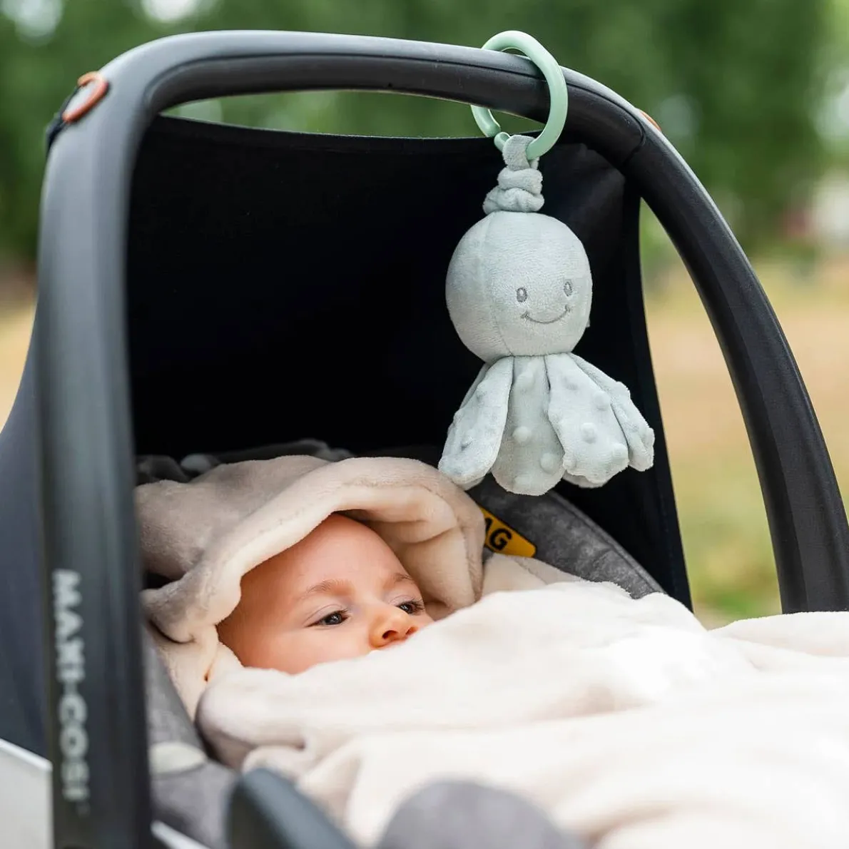 The cute octopus cuddly with its pretty fur conquers the hearts of newborns worldwide. The adorable octopus offers countless grasping possibilities and thus promotes the development of motor skills. In addition, there is an integrated vibration function that playfully refines the child’s sense of touch and auditory skills and provides plenty of entertainment.