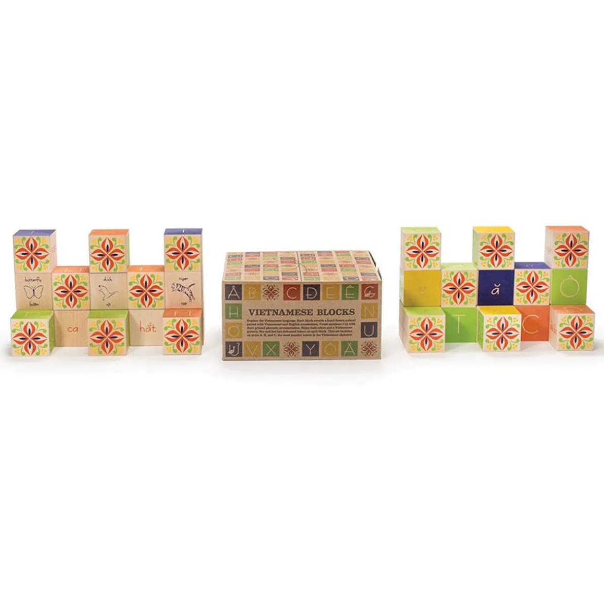Enjoy the bold color and pattern. Each block reveals a hand drawn animal paired with Vietnamese and English translations. Count numbers 1-32 with their printed phonetic pronunciation. Two debossed letters per block.