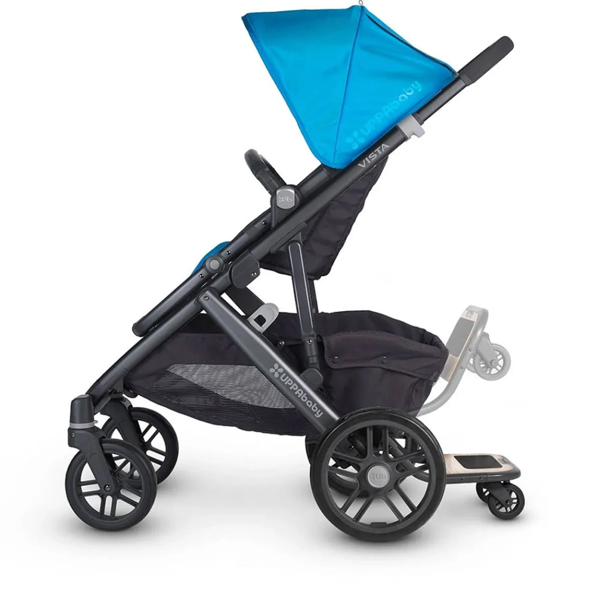 The PiggyBack ride along board easily attaches to the back of your VISTA stroller to allow your toddler to join in the stroll, even when they are too tired to walk on their own.