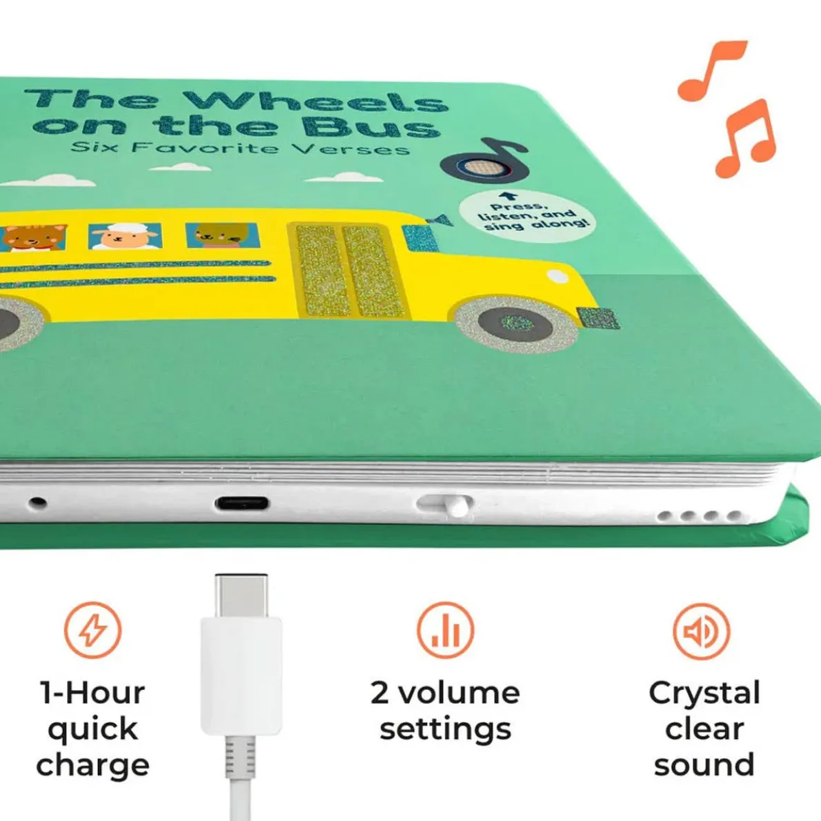 Enjoy singing the entire Wheels On The Bus Six Verses! The interactive design and dynamic illustrations make it easy to learn. Find sounds of different parts by pressing the interactive sound button and take a joyful journey through town. Let your kid take control with this beloved nursery rhyme and its adorable picture book! With this book, your child can enrich their motor skills and build a love for literature. Suitable for any age, this book is sure to engage even the youngest ones – from a few months old. Songs featured: Wheels, Driver, Wipers, Horn, Doors, Baby.