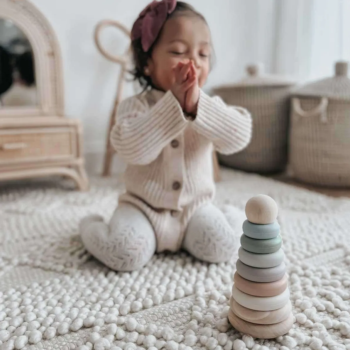 Little ones will love playtime with the noüka Wood and Silicone Stacker. The silicone stacking tower helps develop color recognition, organization, and fine motor skills. The stacking tower comes with six soft and flexible silicone discs in an array of modern shades for building and counting. A seventh wooden disc and sturdy wood base keeps pieces in place. The lightweight wood ball can be used for playtime and keeps discs organized and contained while not in use. Made from soft and flexible food grade silicone and natural beech wood, this stacking toy is nontoxic and safe for little ones.