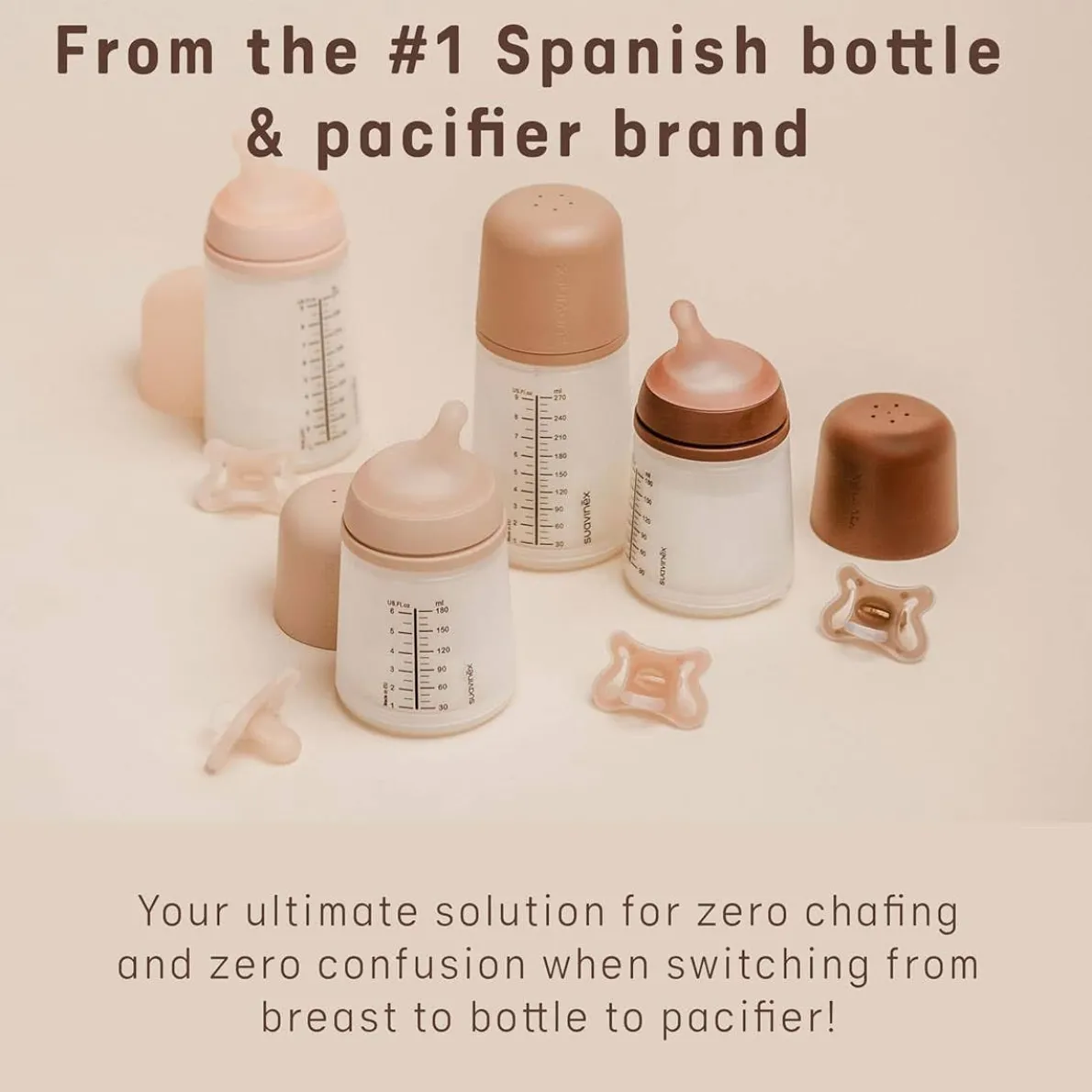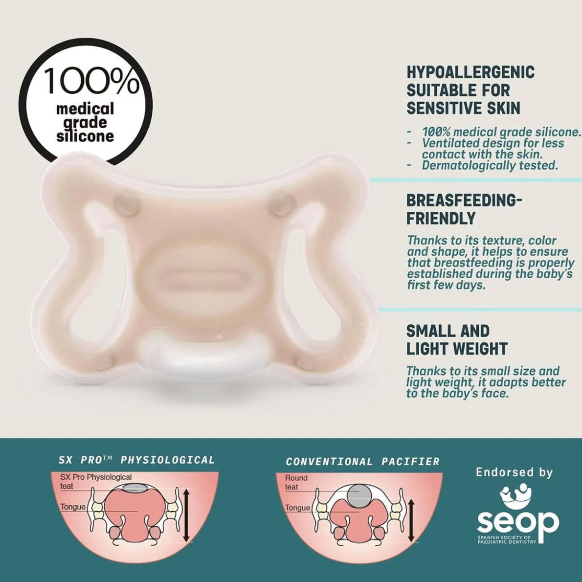 Meet the Suavinex Zerø.Zerø™ Pacifier, your ultimate solution for zero chafing and zero confusion when switching from breast to bottle to pacifier! Proudly brought to you by the #1 Spanish bottle & pacifier brand that has been beloved by parents for over 40 years, the Zerø.Zerø™ pacifier is designed in Spain for even the most sensitive skin and is made from 100% medical grade silicone. Thanks to its ventilated one-piece design, there is minimal contact with the baby’s skin to prevent chafing, while its innovative shape is skin-friendly and zero-invasive in the baby’s oral development. This pacifier’s texture, shade and shape is designed to minimize nipple confusion, making it easier for babies to transition from breast to bottle to using the pacifier without any disruption to their breastfeeding experience.