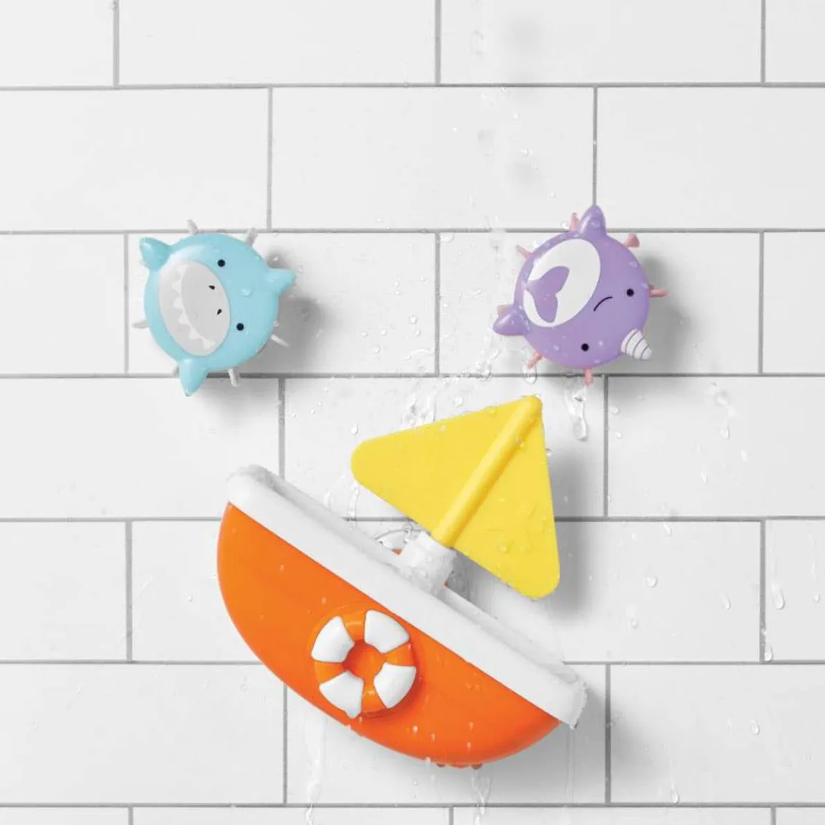 Sail into tub time fun with Skip Hop cute ZOO®️ bath toy. This tipsy-turvy boat plus shark and narwhal shipmates suction to the wall for an extra splash of fun. Pour water onto the boat to make it tip or pour over the characters and watch them spin.